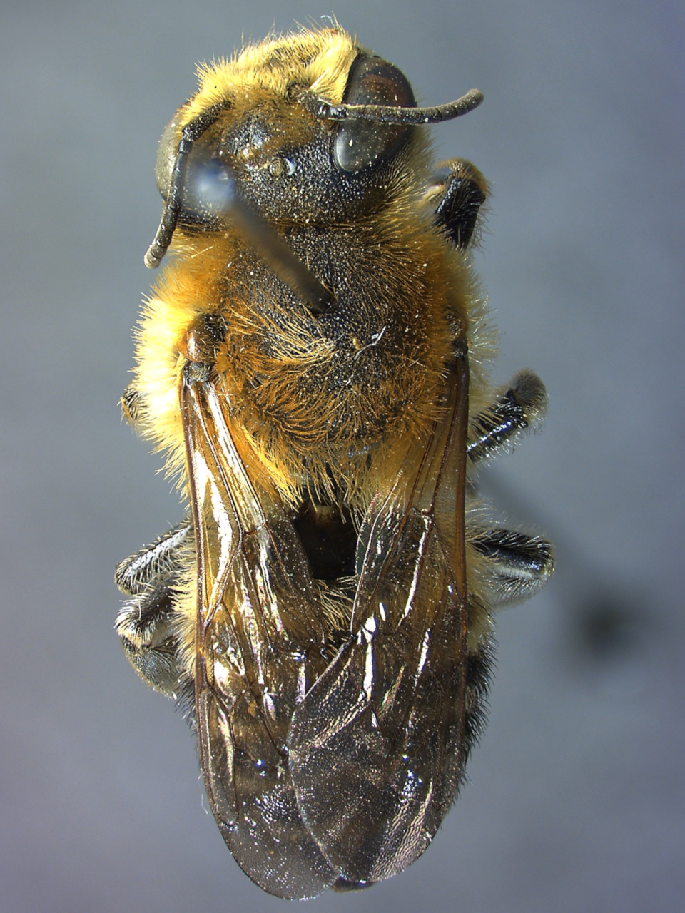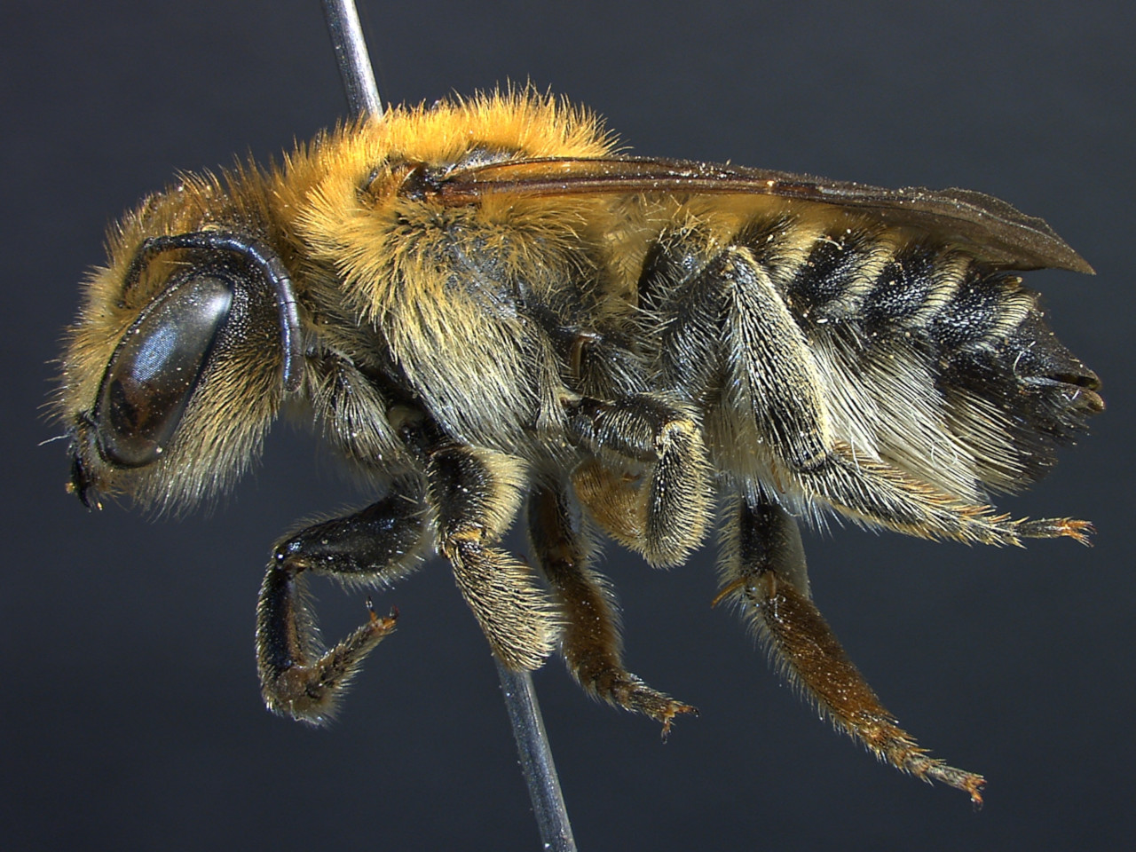 体は黒色。ツルガハキリバチによく似ているが、雌雄とも頭頂部や胸部背面に黒色の毛がない点などで異なる。