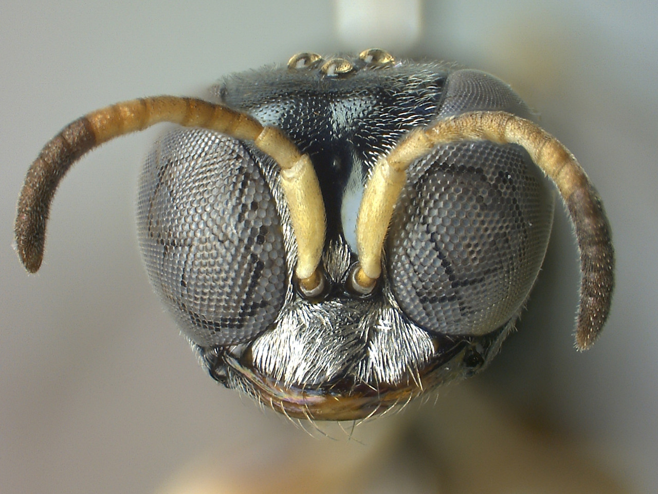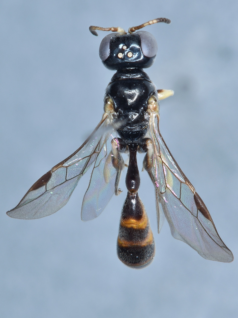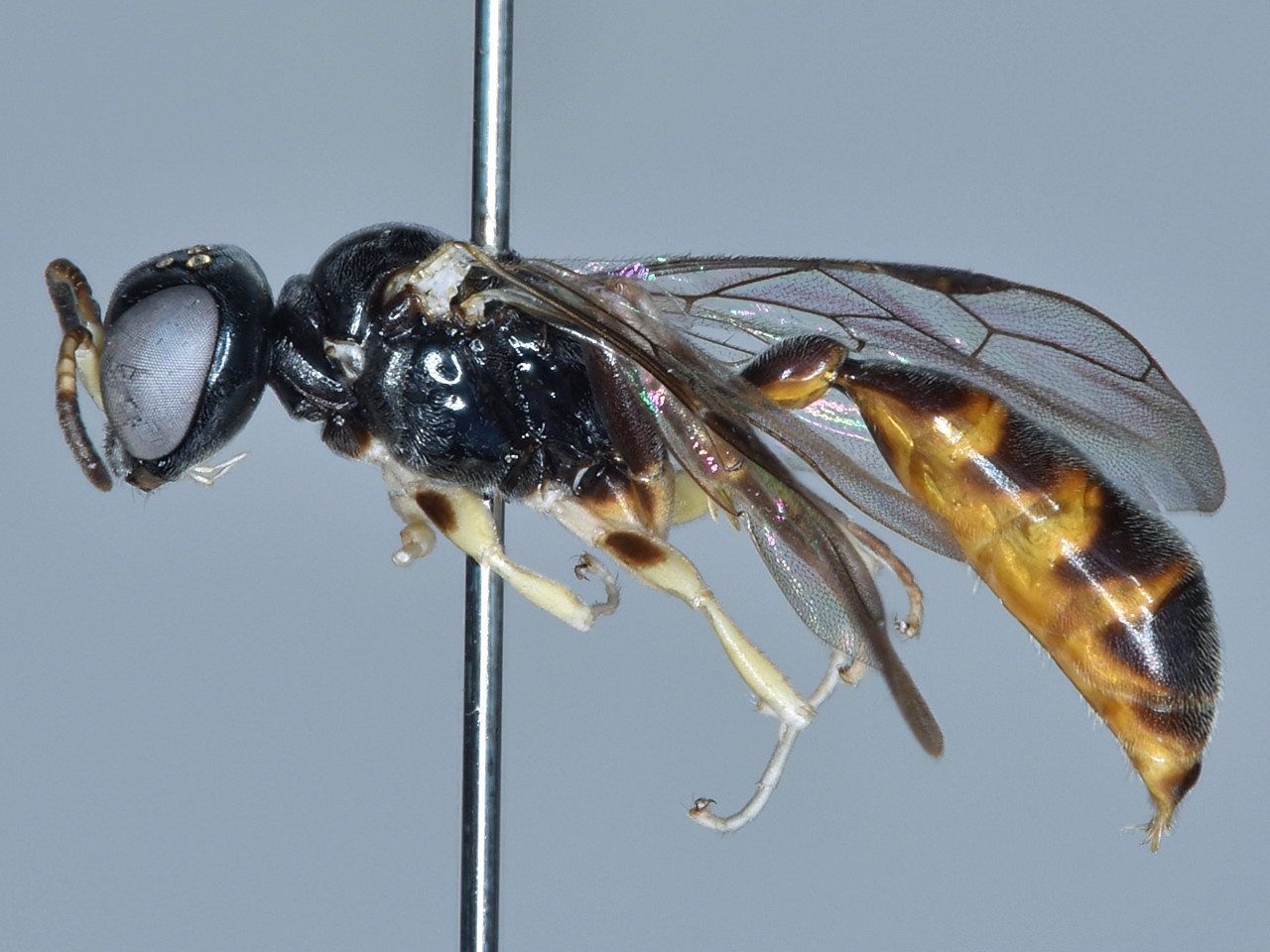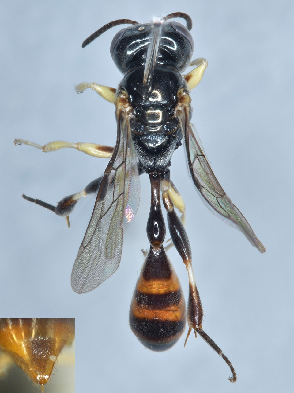 腹部第1節は細く柄状となる。体は主に黒色で、腹部第2、3節に褐色斑がある。前脚、中脚は主に黄色。エゾギングチに似ているが、メスの頭盾前縁に切れ込みがある。チャタテムシ類を狩る。