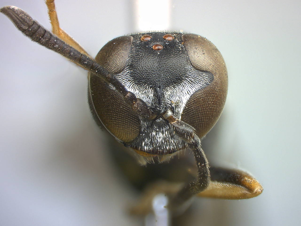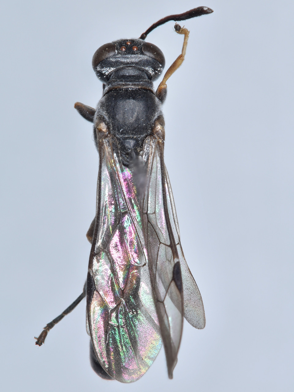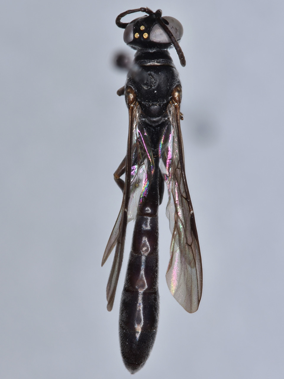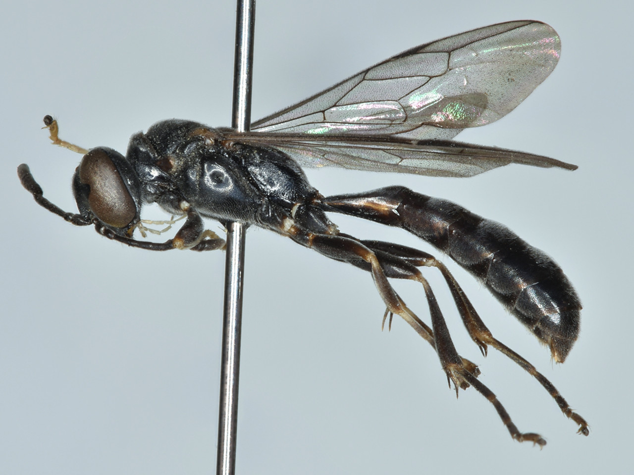 ミヤマジガバチモドキ 腹部第1節は基方から徐々に広くなる棍棒状。腹部は黒色だが、第2、3節の一部に少し赤味がある。マダラジガバチモドキに似ているが、脚は大半が黒色で、メスの頭部正面は逆三角形に近い。
