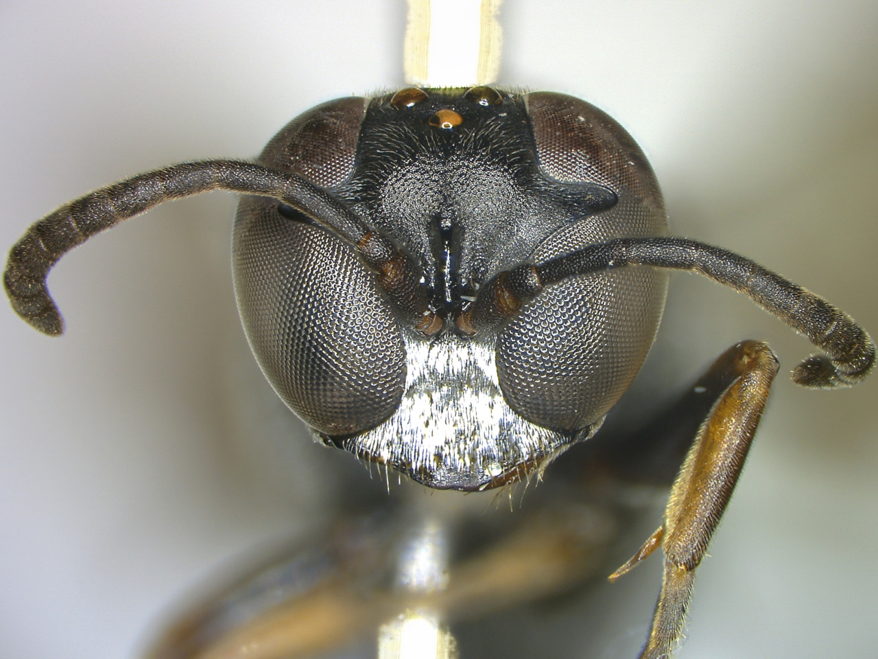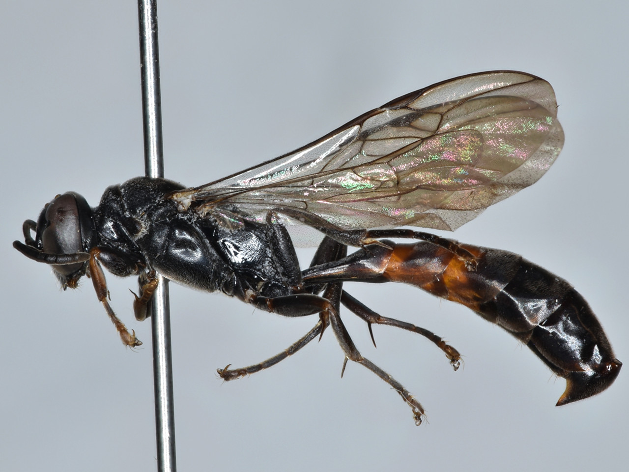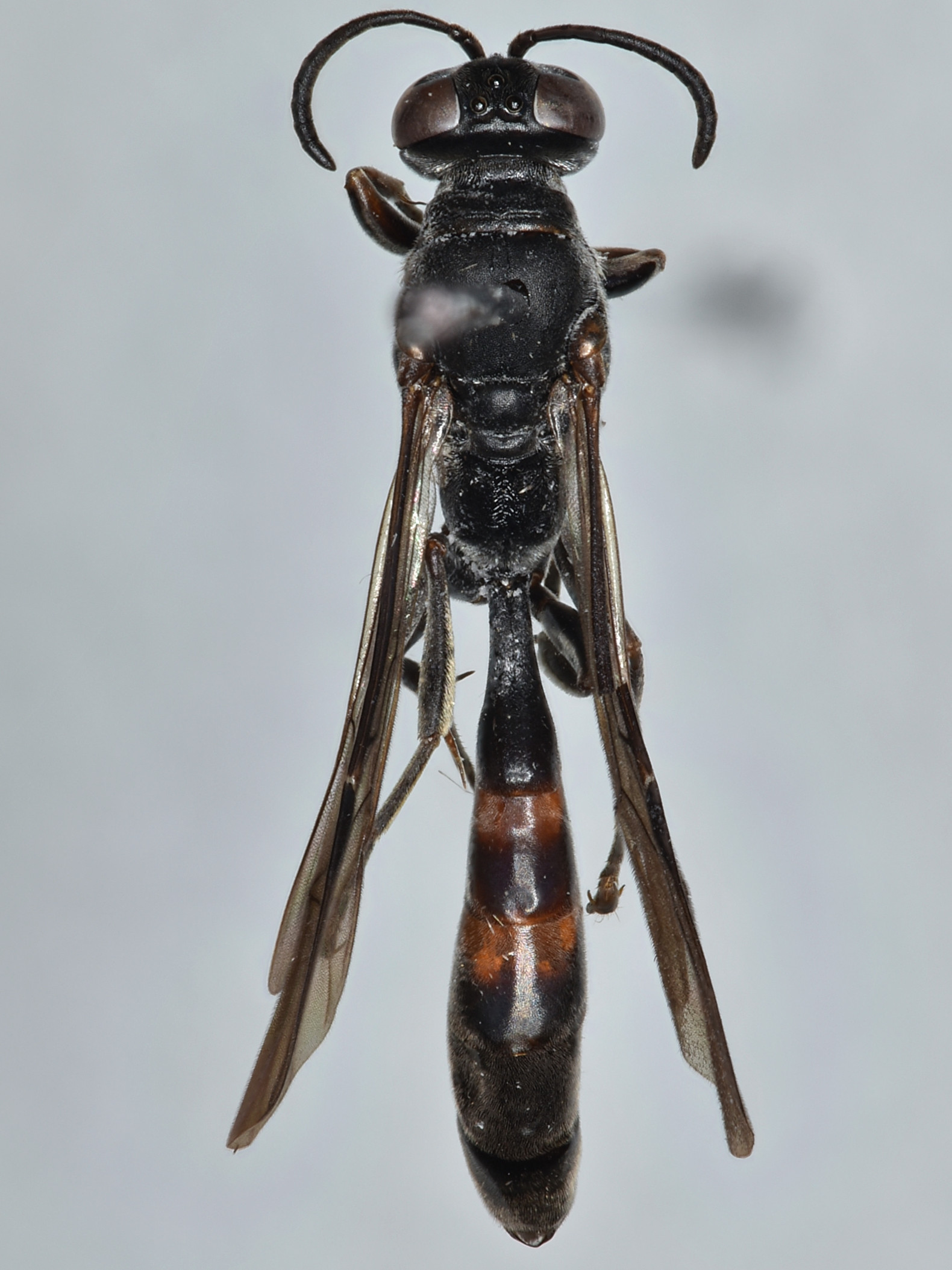 コシブトジガバチモドキ 腹部第1節は基方から徐々に広くなる棍棒状。メスでは腹部第2、3節に赤色部があることが多いが、ほぼ全体が黒色のこともある。ミヤマジガバチモドキと比べると、メスの額の点刻がよりまばらで、前伸腹節の側面の光沢が強い。