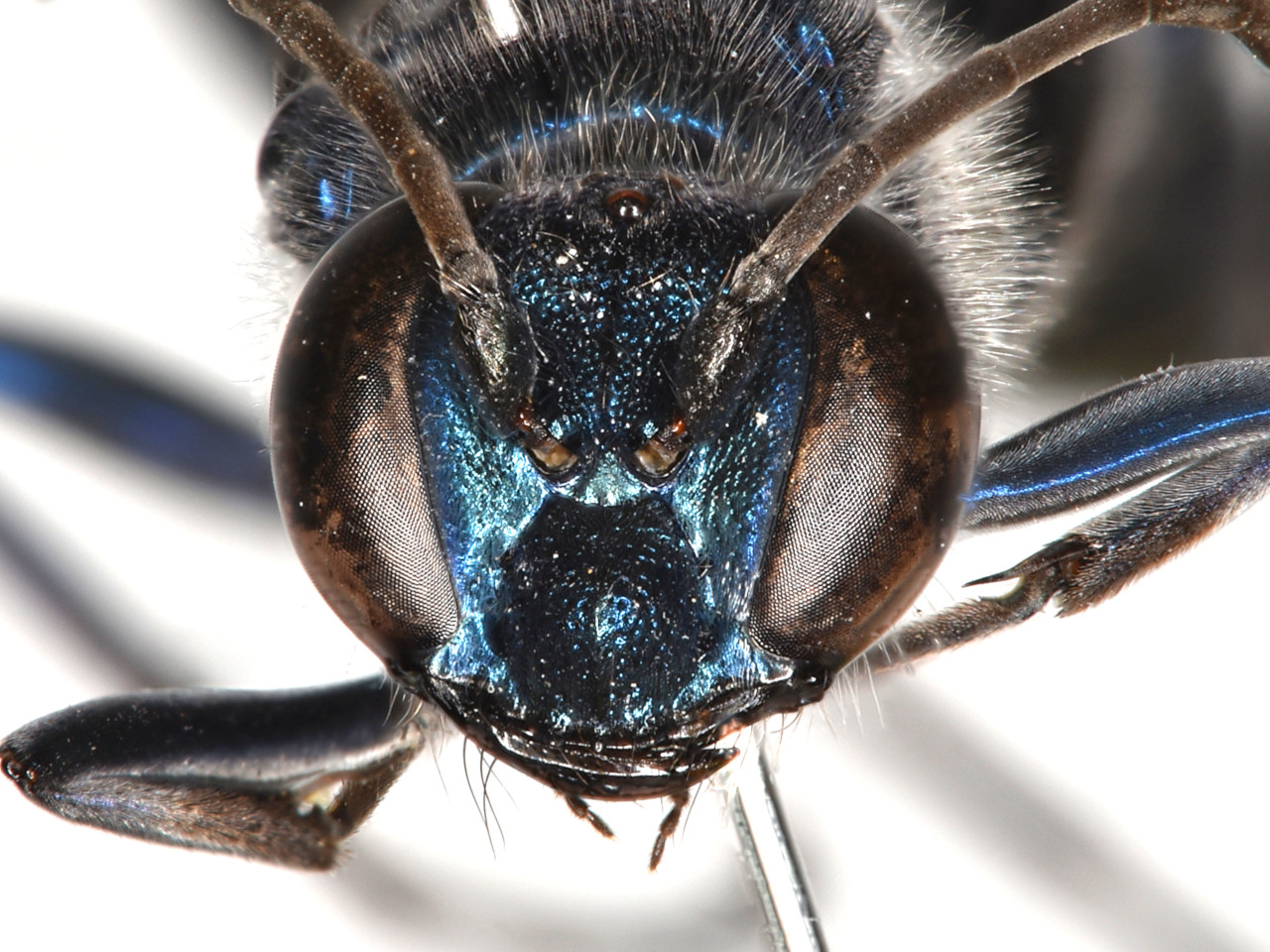 ヤマトルリジガバチ 体全体に青藍色の美しい金属光沢がある。竹筒内に泥の仕切りを作り、幼虫の餌としてヒメグモやアシナガグモなどを狩る。繭は黒褐色。筒口の泥栓は白色でよく目立ち、鳥の糞や白壁から削り取って使われる。