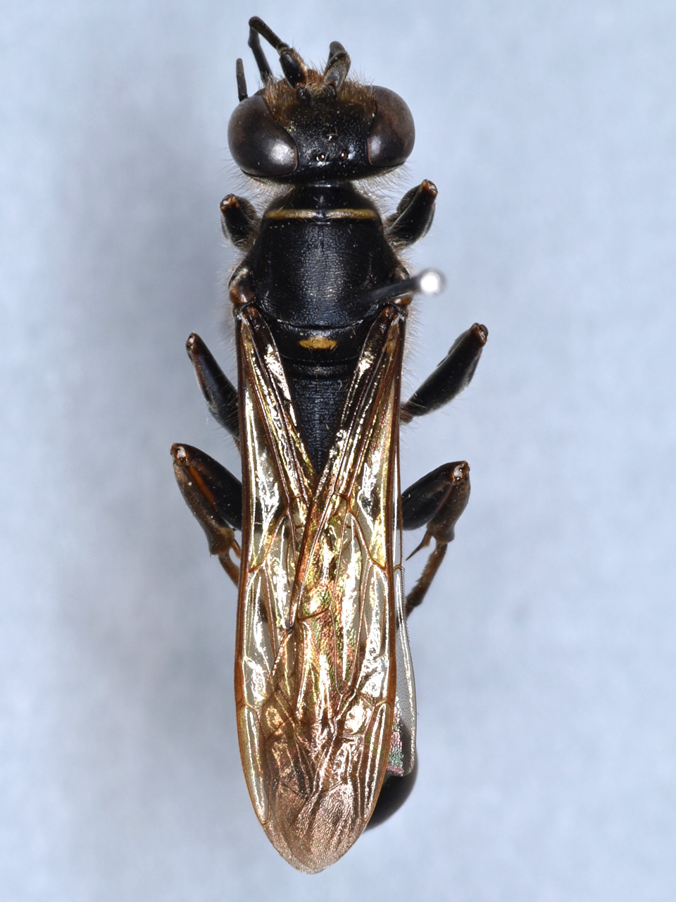 体は黒色で、前胸背板、中胸側板、小盾板、前伸腹節に黄色部がある.腹部第1、2節の後縁は赤褐色。基本的に借孔性ではないが、太めの竹筒内に泥壺状の巣を造ることがある。ハエトリグモ類を狩る。