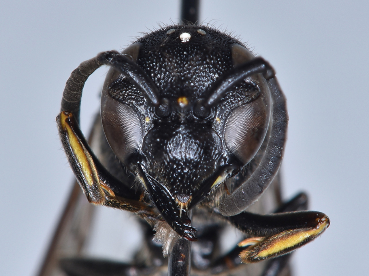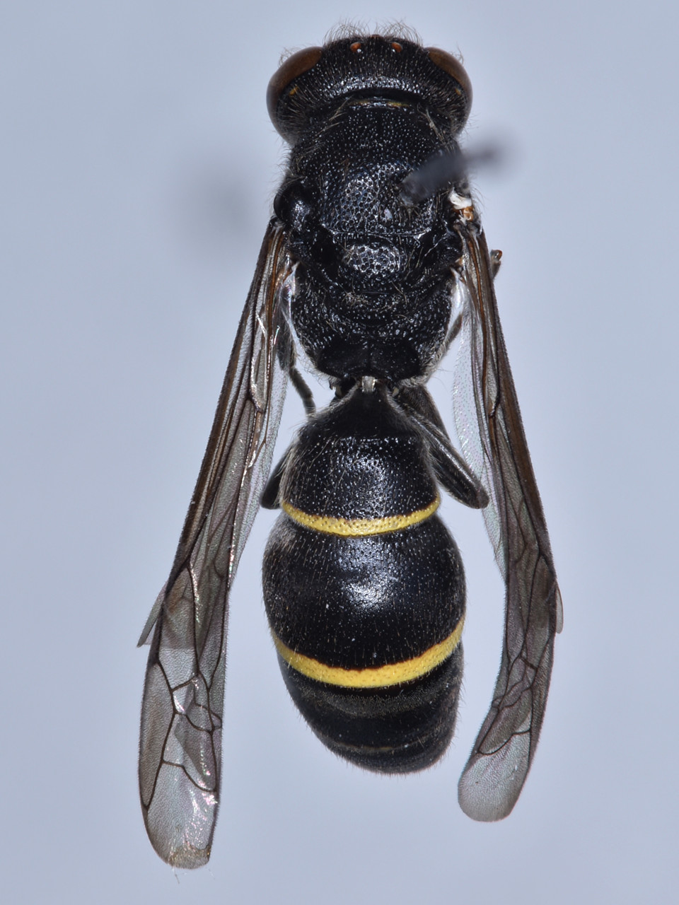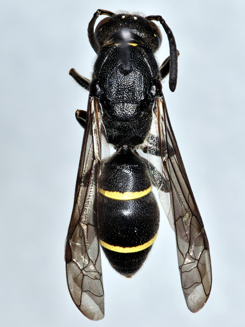 体は黒色で、腹部第1、2背板の後縁に黄色帯がある。ヤマトスジドロバチに似ているが、メスの頭盾は全体が黒色で黄色紋がない。ハマキガ類などの幼虫を狩る。