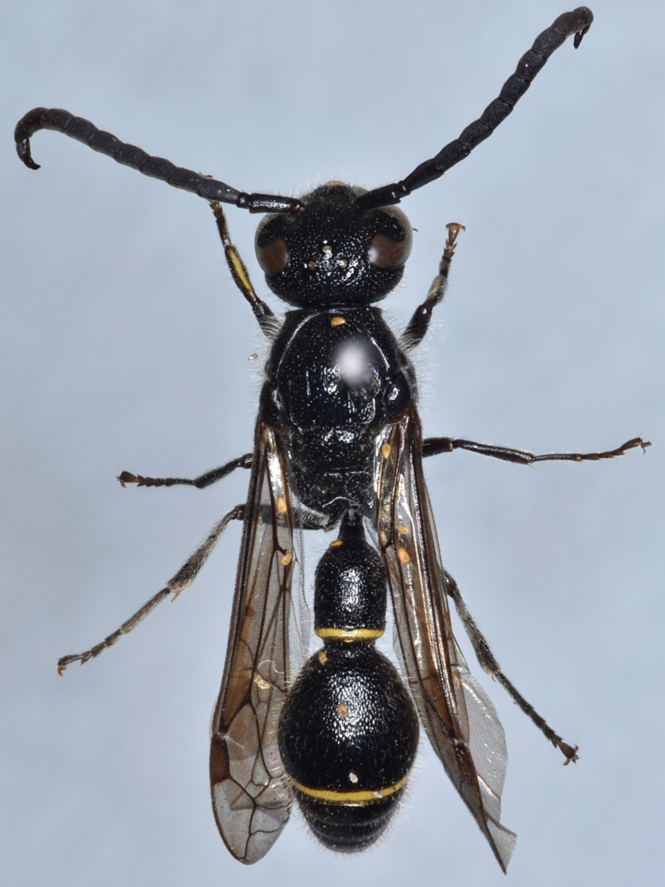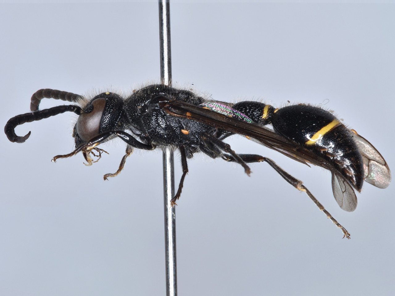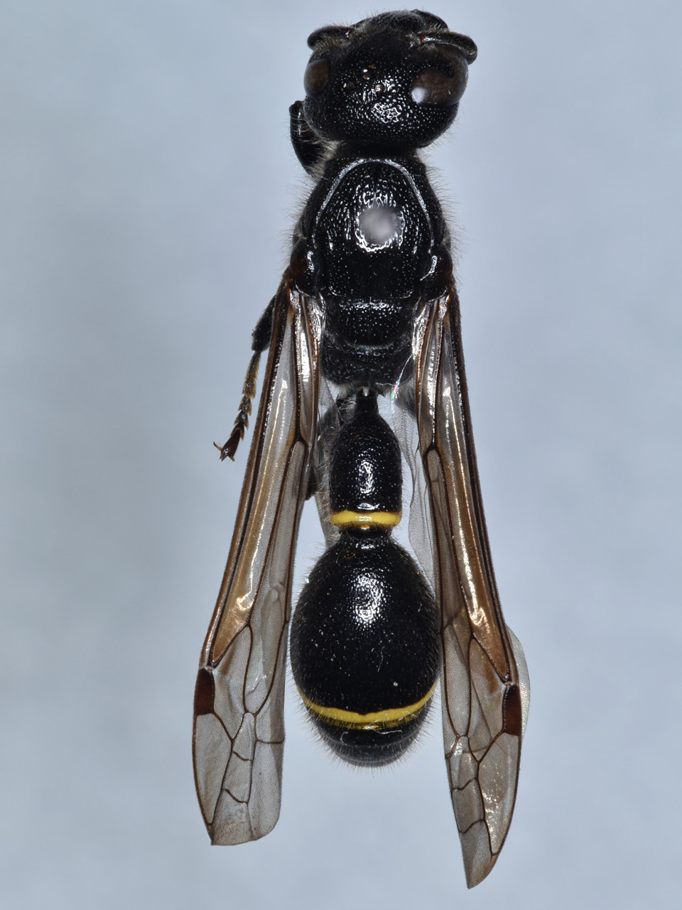 フタスジスズバチ 比較的大型で細長い。体は黒色で、腹部第1、2背板に黄色の細い横帯がある。胸部はつや消し状だが、腹部には光沢がある。ドロバチ類としては珍しく、植物の葉片をかみ砕いたもの(濃緑色~茶色)を使って営巣し、育室の間には細かい葉片が詰まる。幼虫の餌としてハマキガ類などの幼虫を狩る。