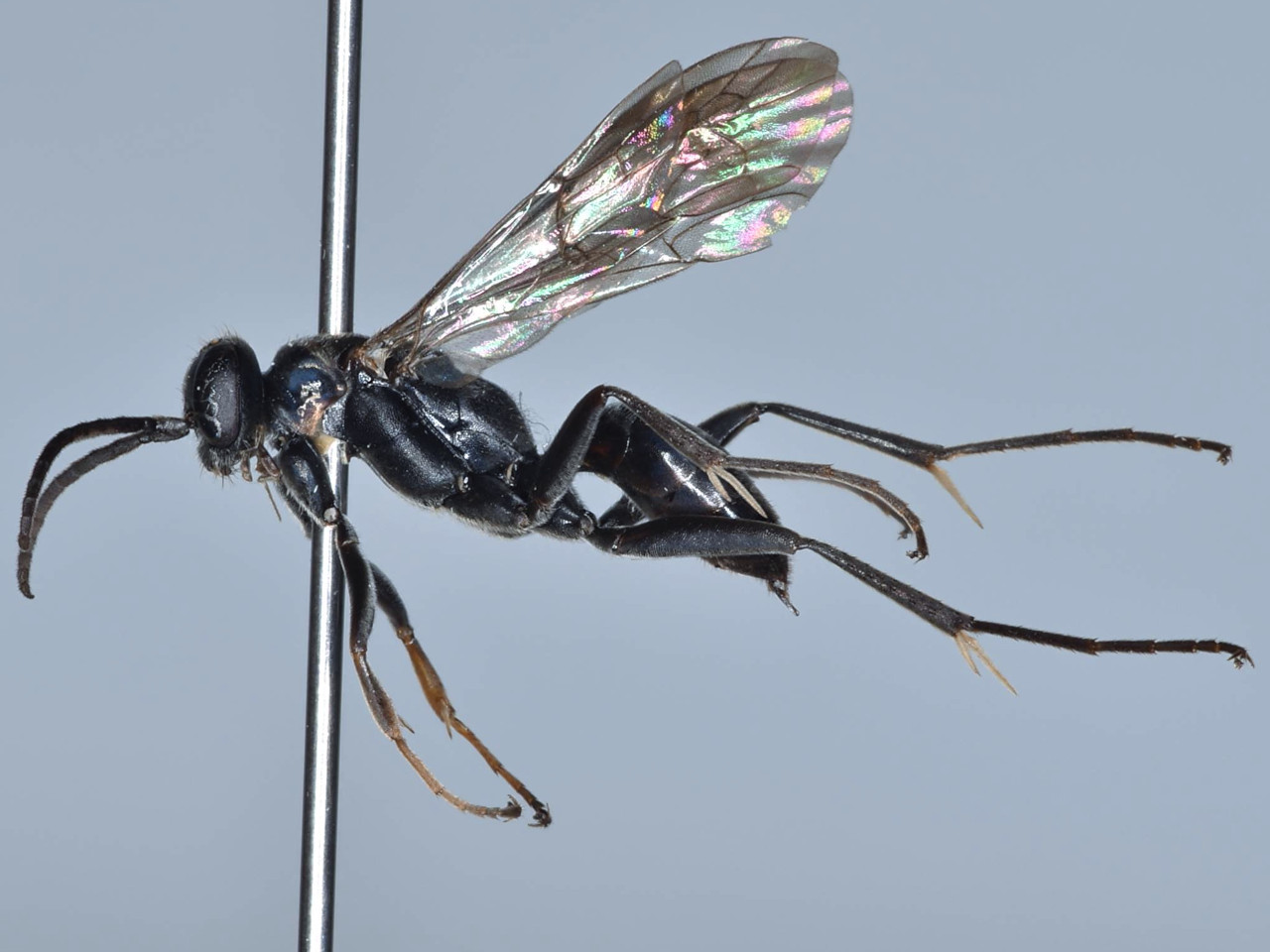 体は黒色で、ペレエヒゲクモバチに似ているが、メスの中・後脚腿節下面の立毛が短い。