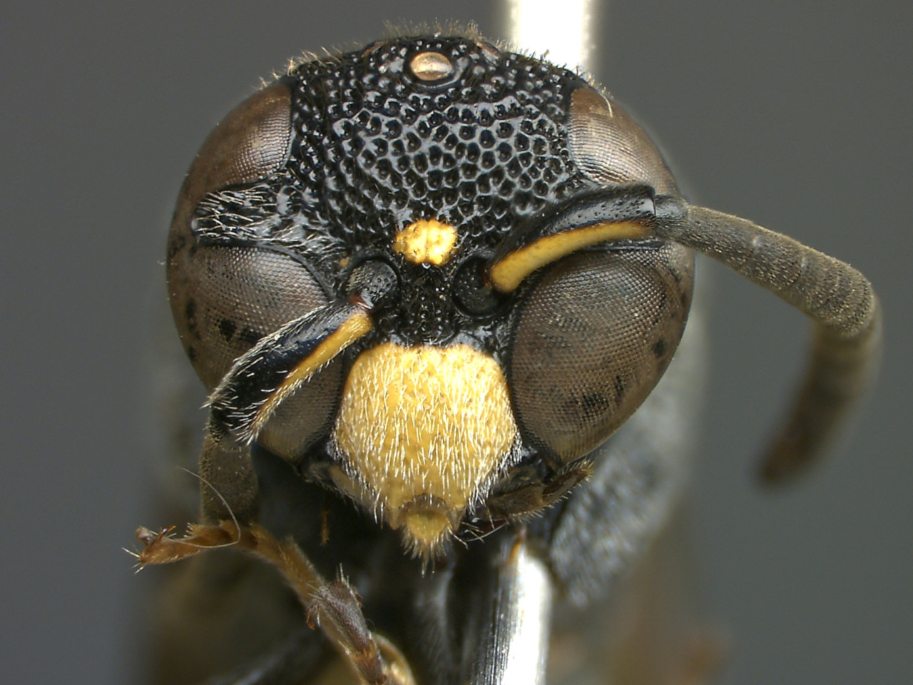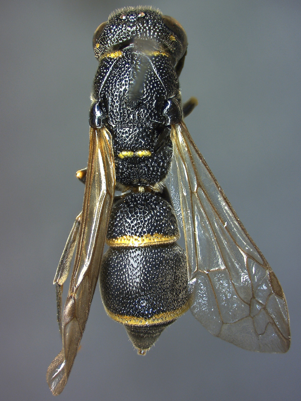 体は黒色で、腹部第1、2背板の後縁に黄色帯がある。肩板(翅の付け根にある半円形の板)が黒褐色であることが「カタグロ」の由来。側方から見て、腹部第1背板前方の水平部と垂直部の境界が角張らない。竹筒などに泥の仕切りを作って営巣する。ハマキガ類などの幼虫を狩る。