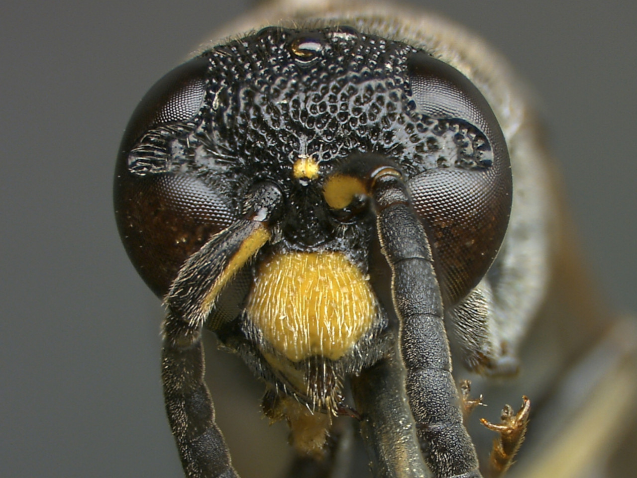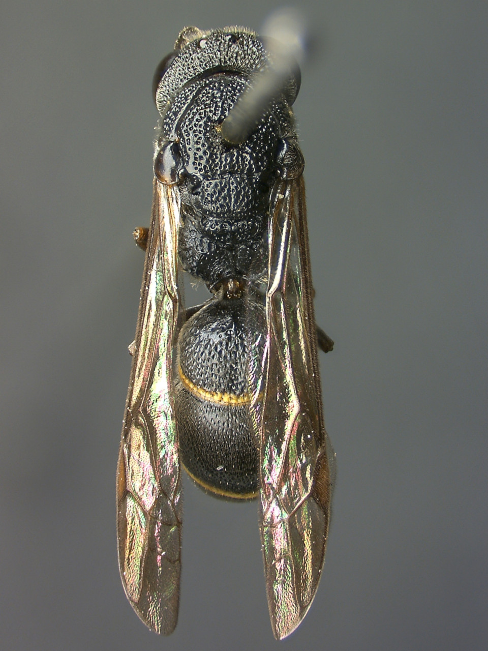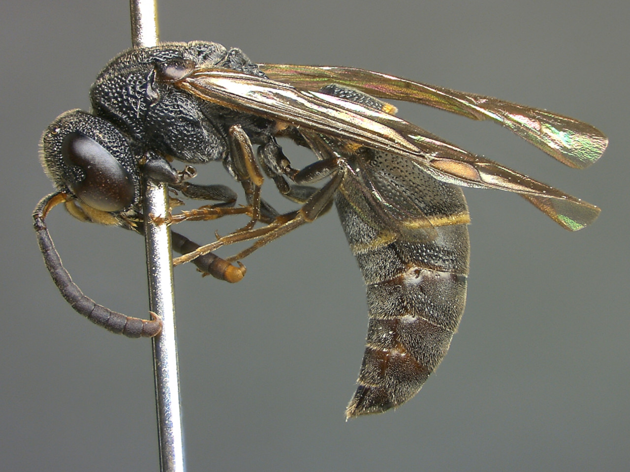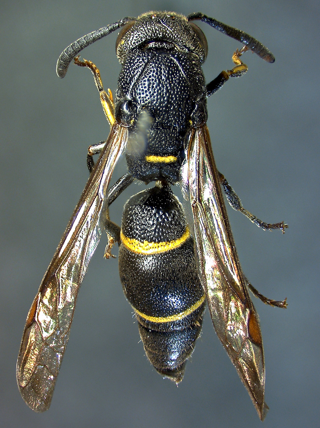 体は黒色で、腹部第1、2背板の後縁に黄色帯がある。前伸腹節に水平な部分がない。側方から見ると、腹部第1背板の前方垂直部と後方水平部の境界が角張る。竹筒などに泥の仕切りを作って営巣する。幼虫の餌としてガ類の幼虫を狩る。本土産亜種の他に伊豆諸島に別亜種がいる。