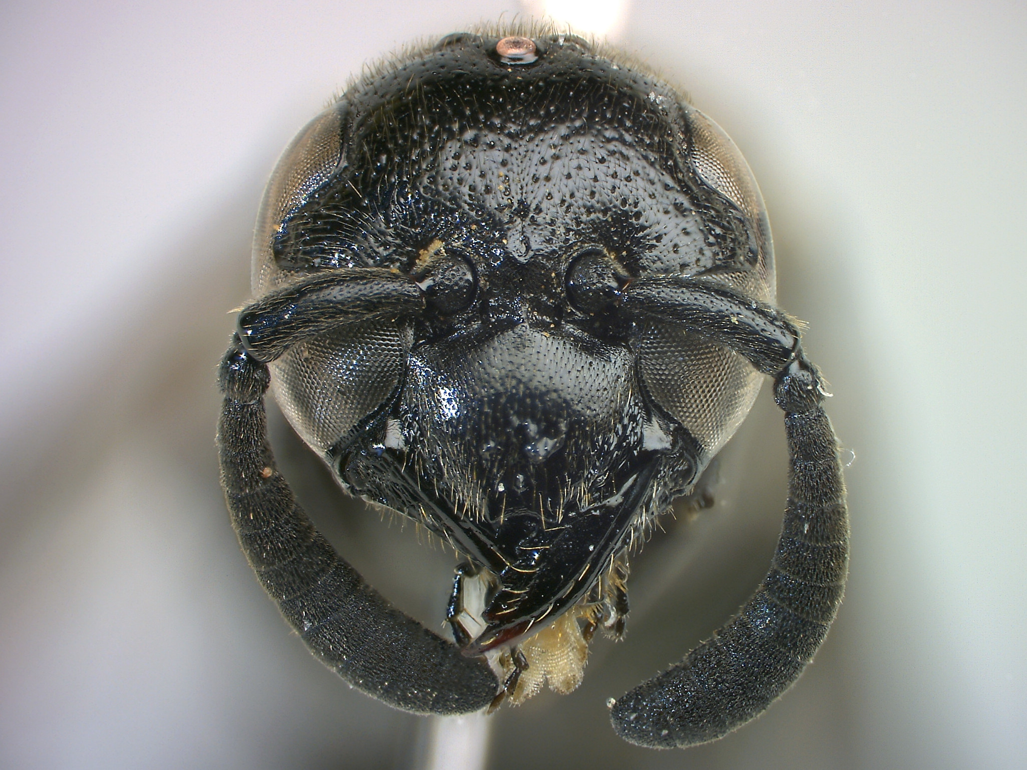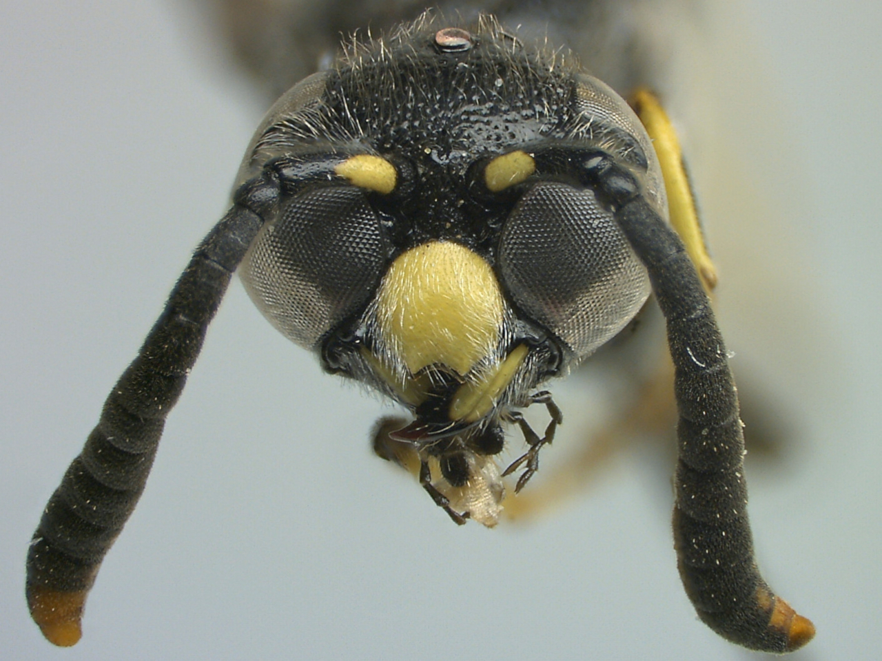 体は黒色で、腹部第1、2、4背板の後縁に黄色帯がある。ハラナガハムシドロバチよりずっと小型で、腹部第1節は縦幅よりも横幅が長く、中央に深い縦溝がある。ノミゾウムシ類の幼虫を狩る。茅葺屋根の細いヨシ筒などによく営巣する。