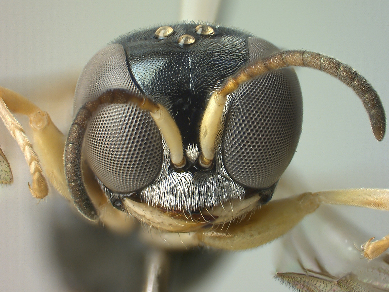 エゾギングチ 腹部第1節は細く柄状。体全体は黒色だが、腹部第2節の後方などは褐色、脚の一部は黄褐色である。頭盾には銀白色の微毛があり、メスでは前縁が長方形状に突出。チャタテムシ類を狩る。日本に20種近くいる本属には借孔性の種が多くいると考えられるが、形態の似た種が多く同定が難しい。