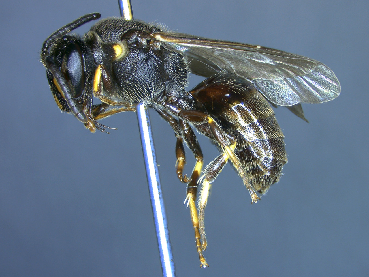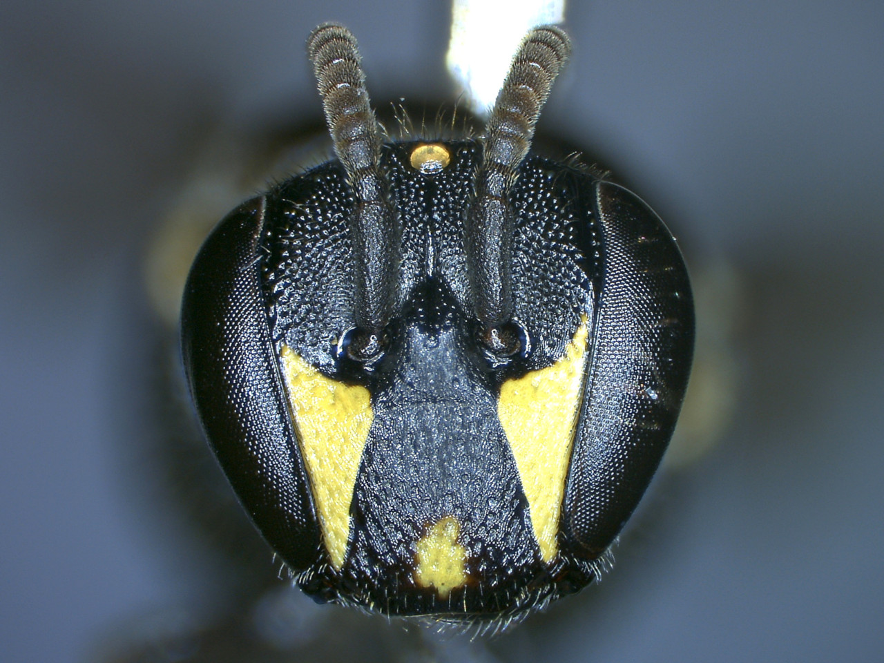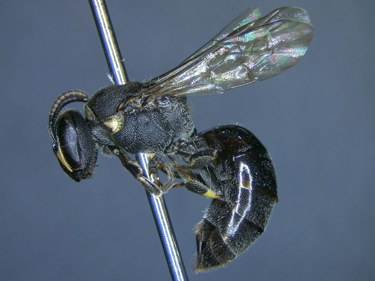 Hylaeus transversalis Cockerell, 1924 Body black, with few hairs; lateral face with yellow spots; second gastral segment shining. Females carry pollen in their digestive tracts, so they do not have brushes on their body surface for pollen transport. Cells in nests are covered with cellophane-like thin films. The genus Hylaeus includes many species that are similar to each other, making identification difficult.