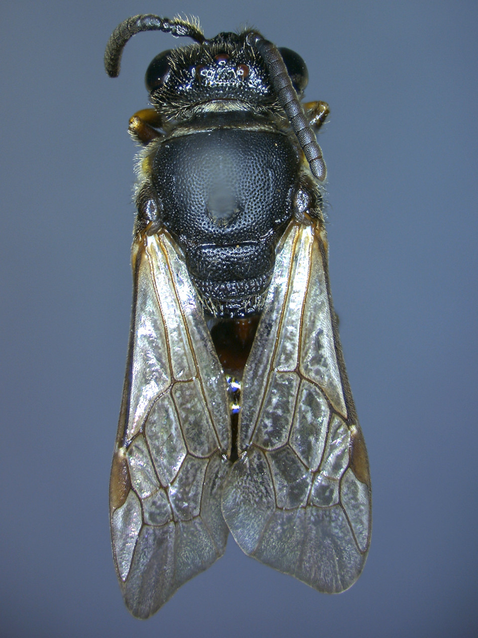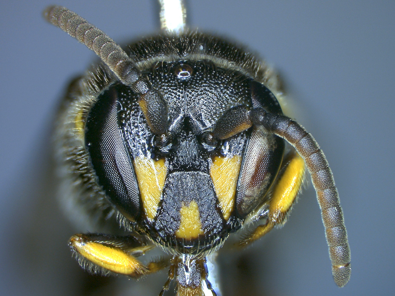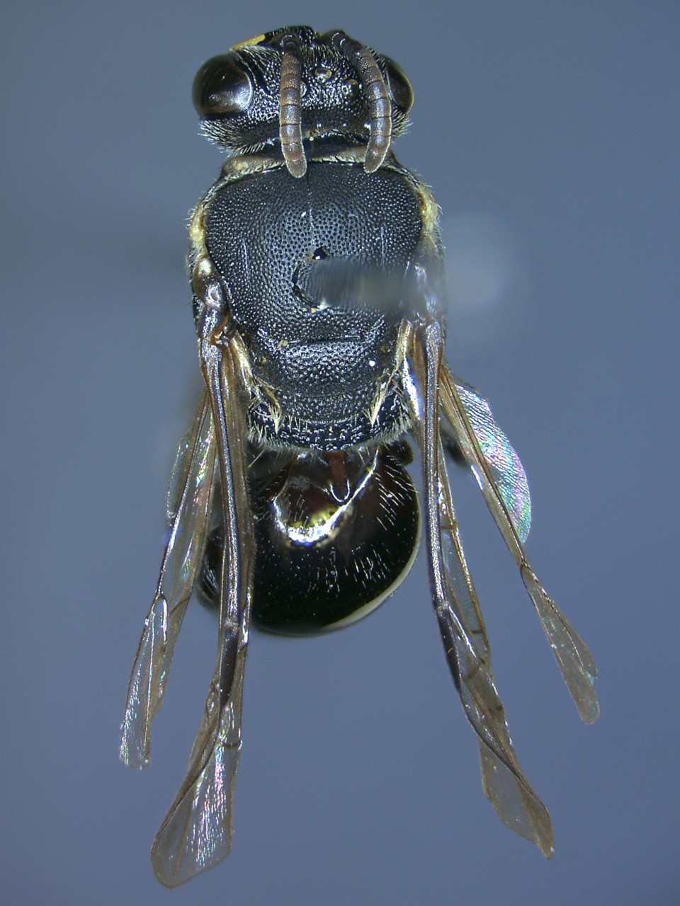 Hylaeus transversalis Cockerell, 1924 Body black, with few hairs; lateral face with yellow spots; second gastral segment shining. Females carry pollen in their digestive tracts, so they do not have brushes on their body surface for pollen transport. Cells in nests are covered with cellophane-like thin films. The genus Hylaeus includes many species that are similar to each other, making identification difficult.
