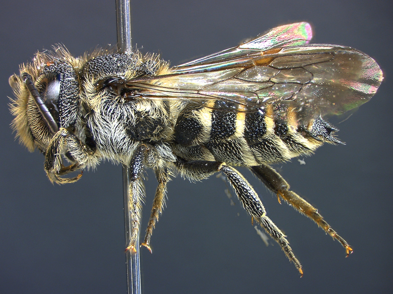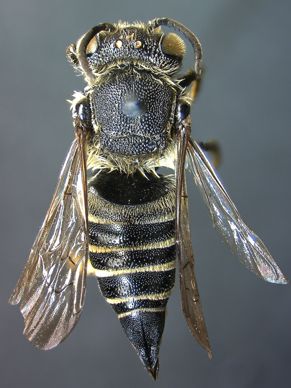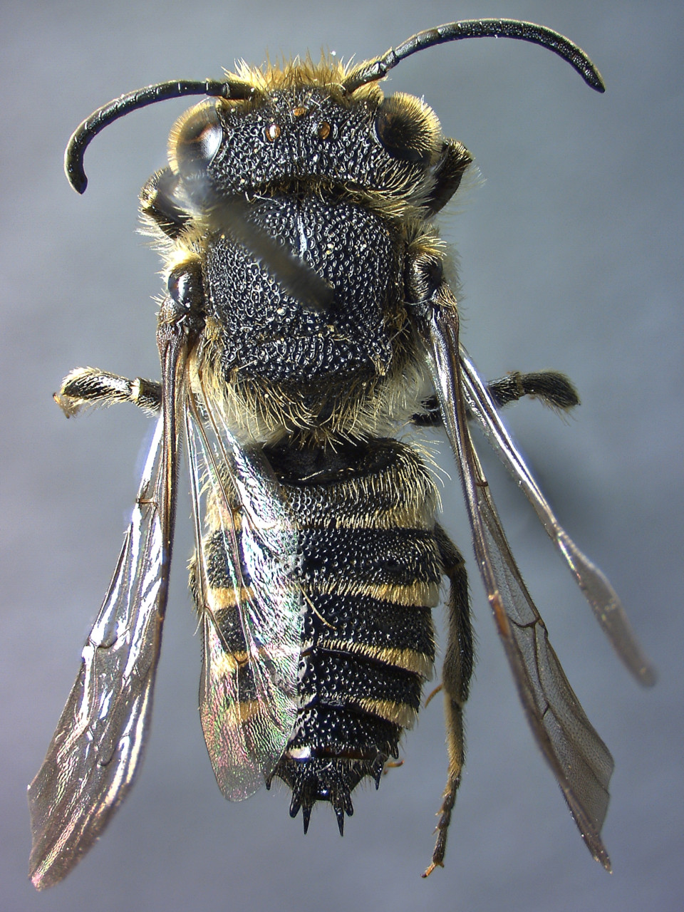 Body black, with white to grayish brown body hairs. Posterior margin of gastral segments 1-5 with a hair band. This species differs from the closely related Coelioxys hosoba in that mandibles of female are nearly parallel at the base, abruptly narrowing at the tip. This species parasitizes Megachile tsurugensis or related species.