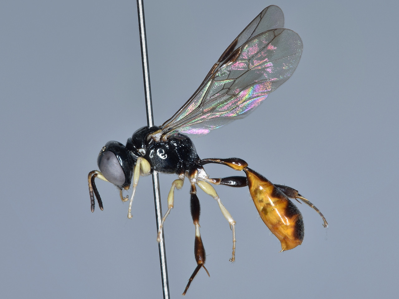 Rhopalum kuwayamai Tsuneki, 1952 Body mainly black, with brown markings on gastral segments 2 and 3. Forelegs and mesosoma mainly yellow. First gastral segment slender and petiolate. Similar to Rhopalum jessonicum, but with a v-shaped indentation on frontal margin of clypeus in female. This species hunts book lice as prey.