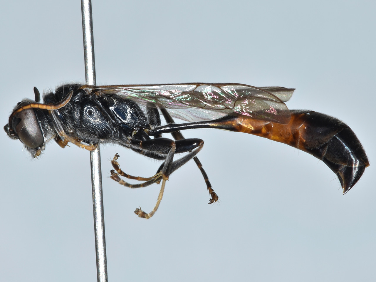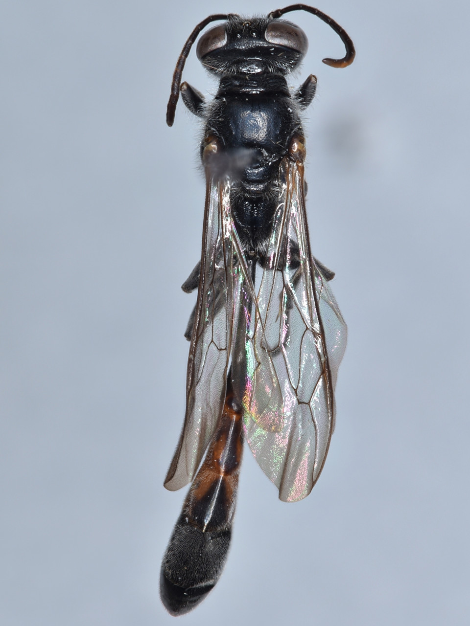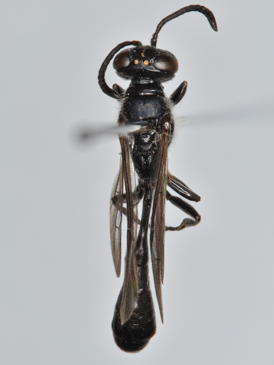 Trypoxylon nipponicum Tsuneki, 1956 First gastral segment flask-shaped, narrow basally and abruptly broadened posteriorly. Second and third gastral segments of female with reddish brown markings. This species hunts spiders of Salticidae as prey.