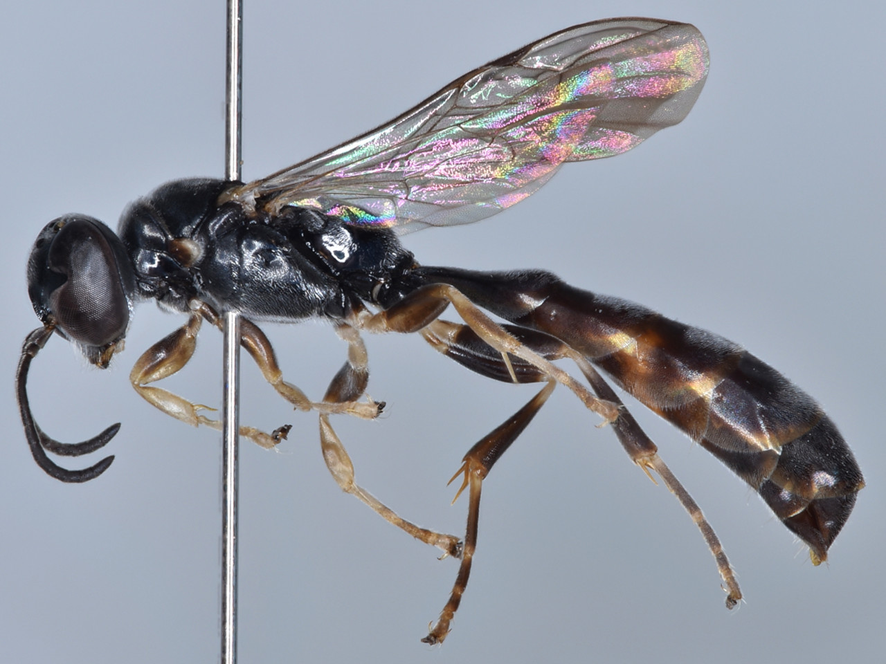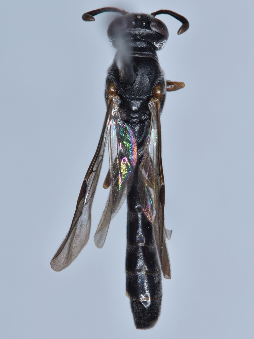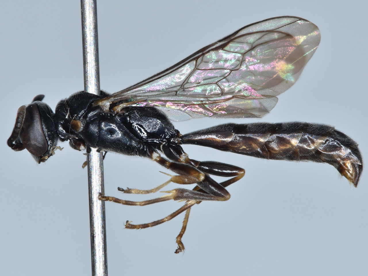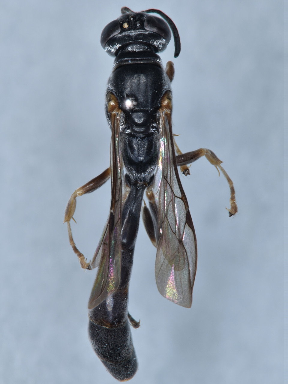 Trypoxylon rufimaculatum Antropov, 1987 First gastral segment club-shaped, gradually widening distally. Gaster black. Legs of females often black and yellowish brown, sometimes almost entirely black. This species is very similar to Trypoxylon varipes, but the female head is more rectangular in frontal view. It hunts a variety of spiders including those of Linyphiidae.