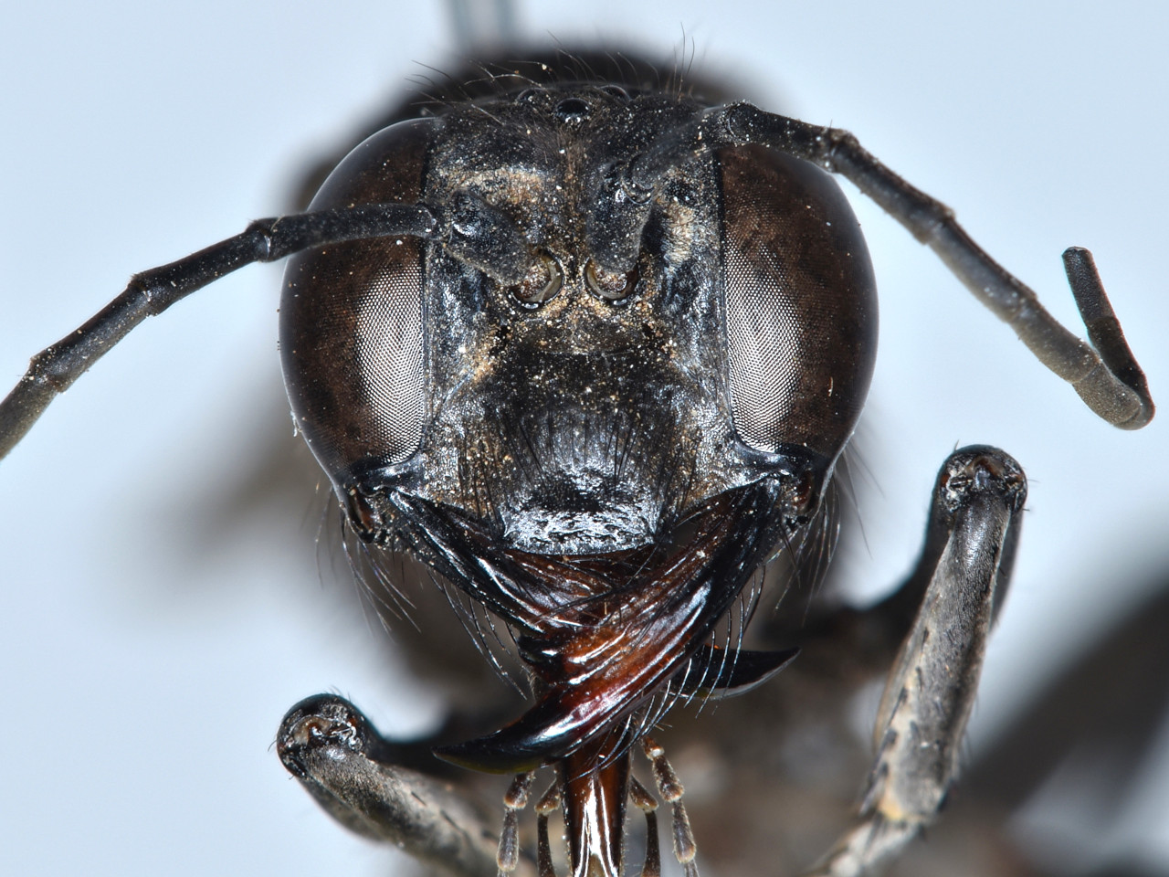 Body black, first gastral segment distally and second segment entirely red. This species uses tiny pebbles or wood chips to construct nests in tree cavities or bamboo tubes. It hunts large larvae of notodontid moths as prey, and always stores a single larva in each cell. Sex ratios of adults produced from trap nests are often extremely female-biased.