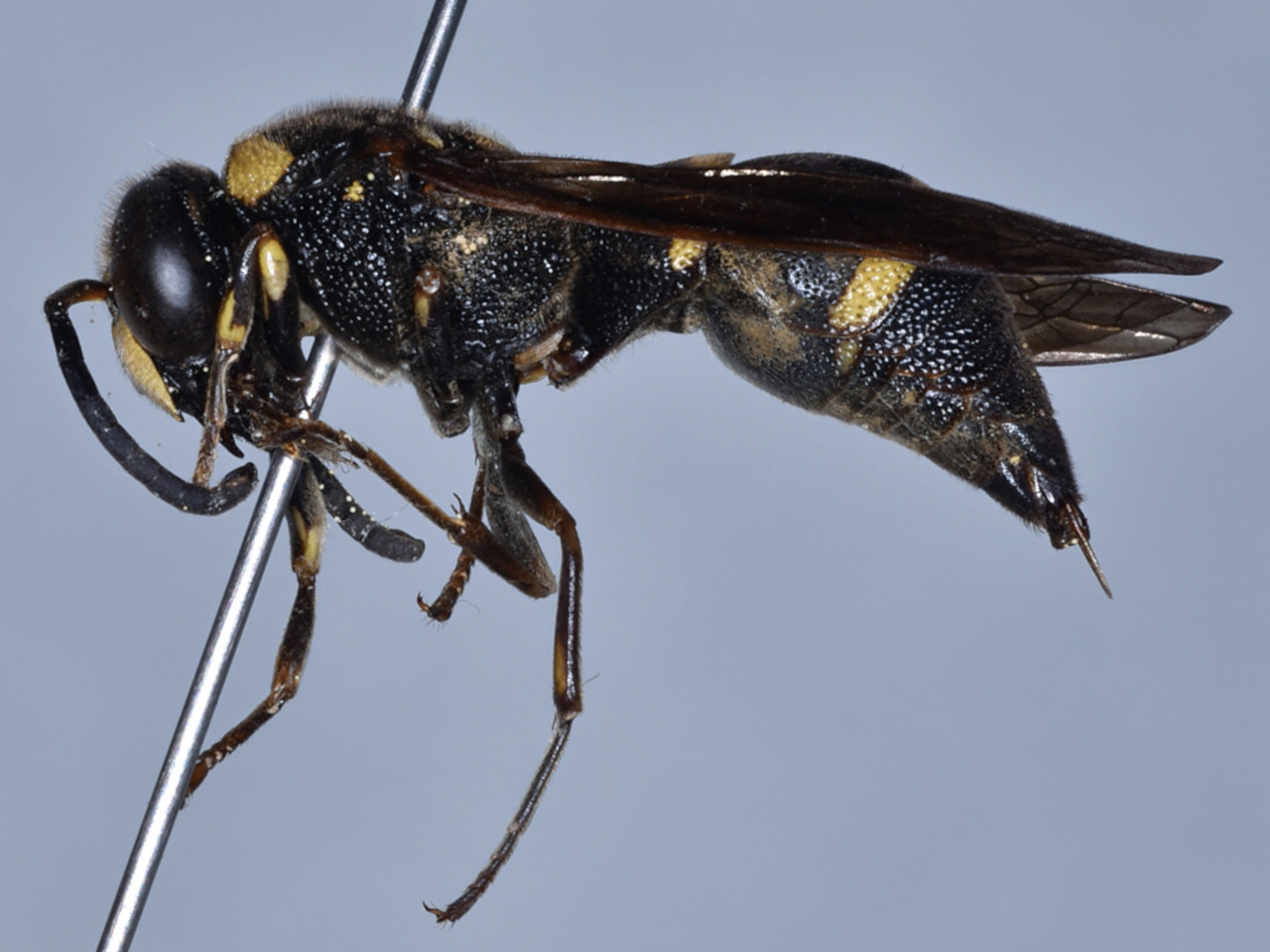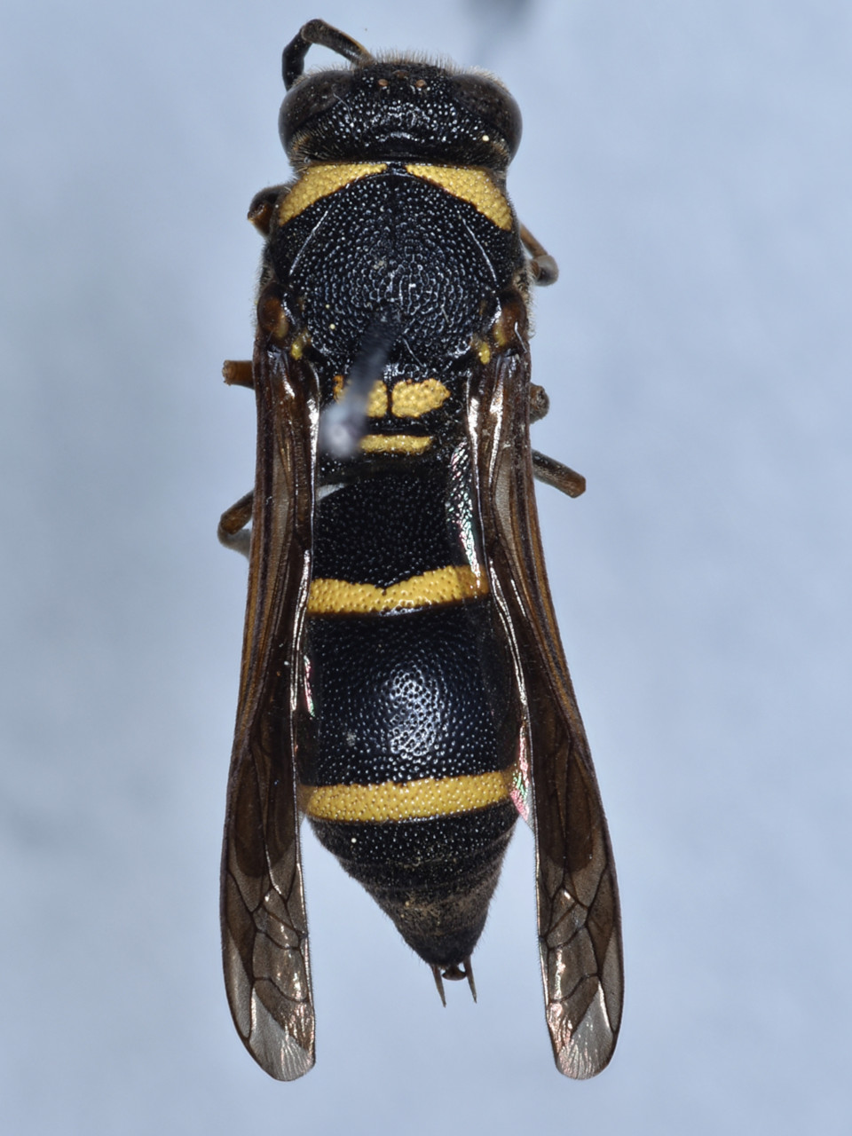 Body black, with a yellow band on the first and second gastral tergites. Divided into eight subspecies according to region. This wasp, active from May to October, nests in old galleries of wood boring beetles or bamboo tubes, partitioning brood cells with mud. It hunts moth larvae of Pyralidae or Tortricidae, and stores them in the cells as larval food. This wasp is one of the most common species found in trap nests in and around residential areas.