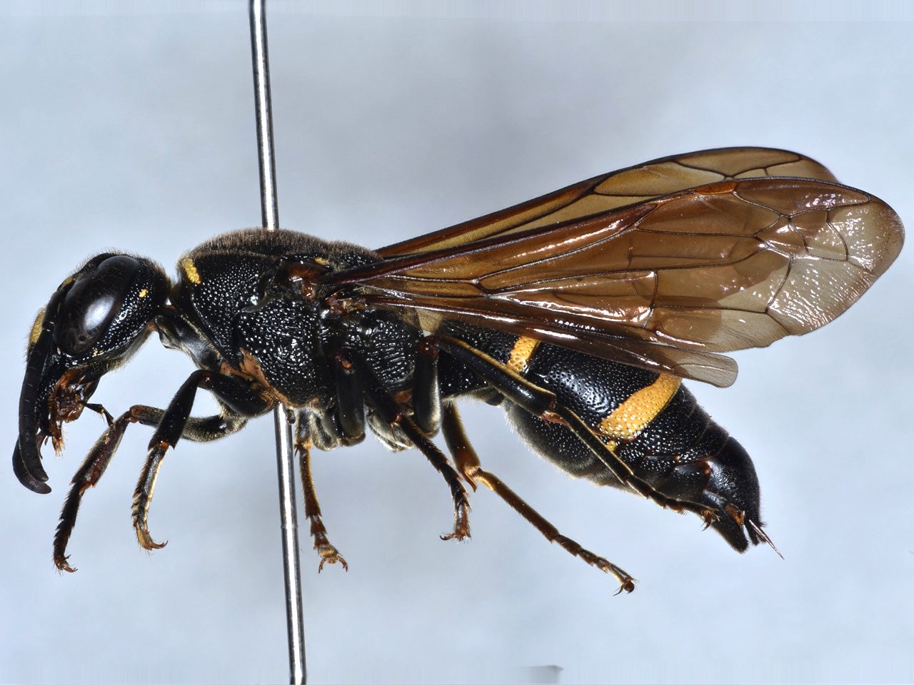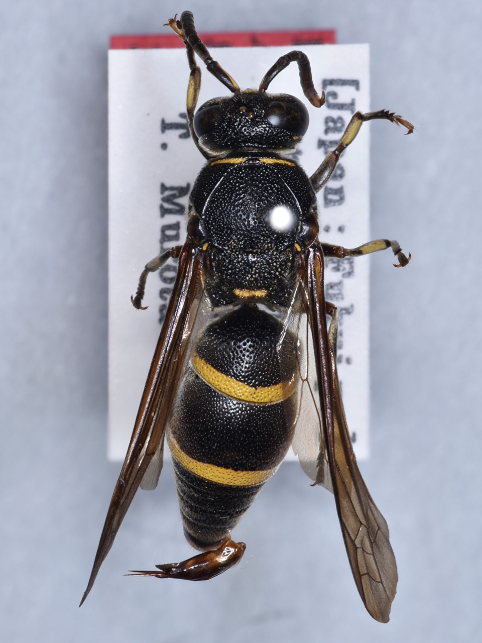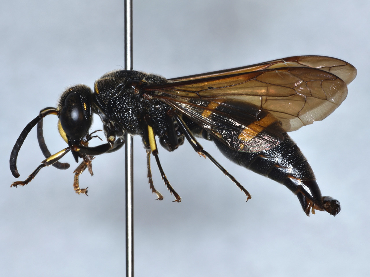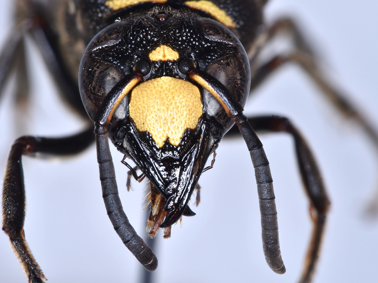 Similar to Anterhynchium flavomarginatum, but distinguishable from it by the raised forehead between the ocellar region and the base of the antennae, a smaller pronotal yellow marking, and no yellow marking on the scutellum. This species was first discovered in Ehime Prefecture in 2010, and has since been collected in the Kanto, Kansai, Chugoku, and Kyushu regions.