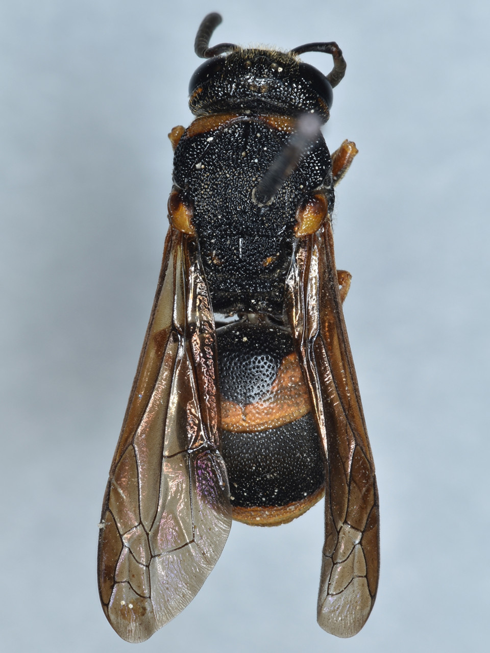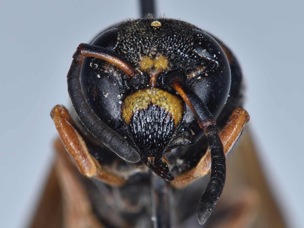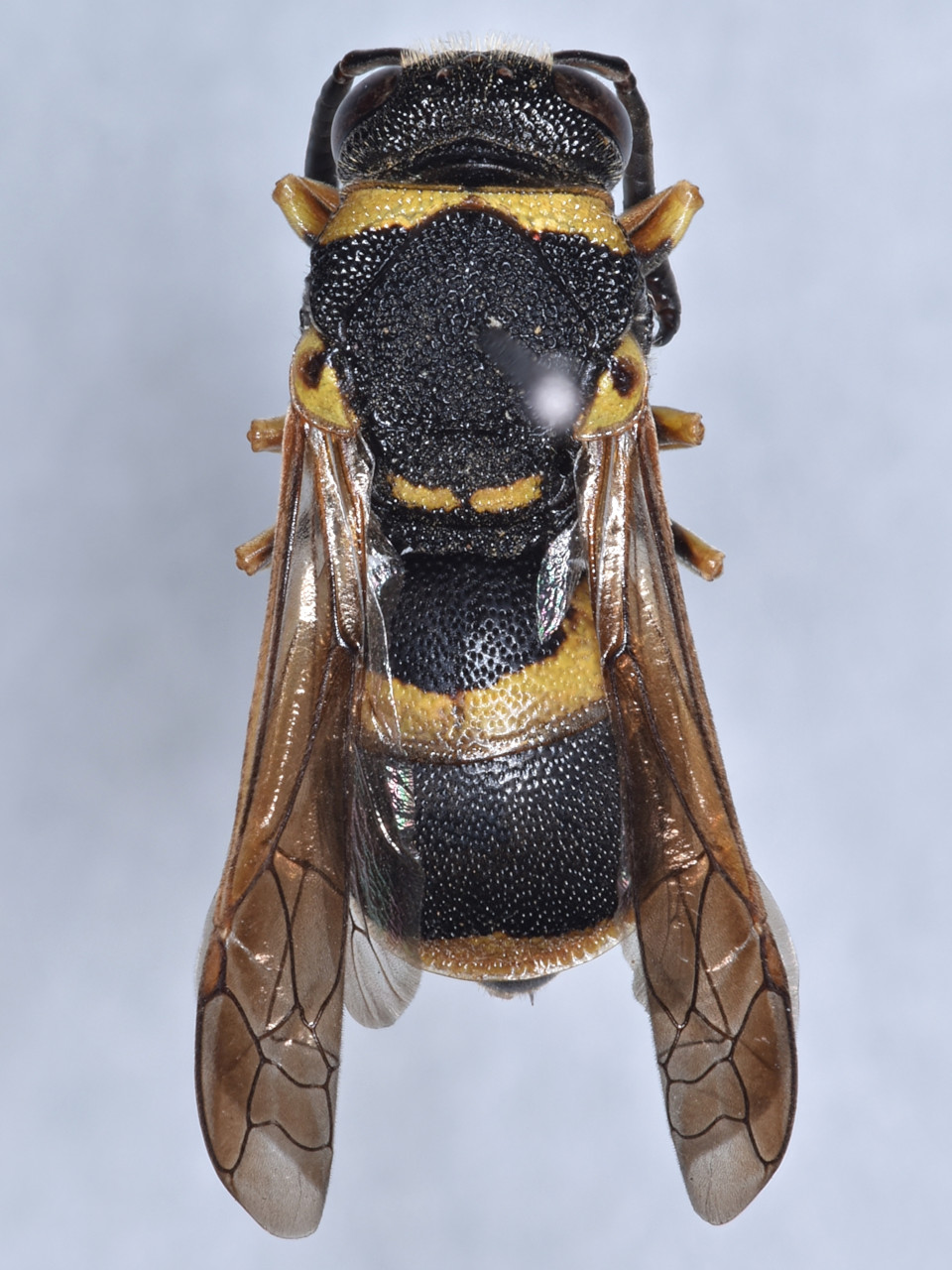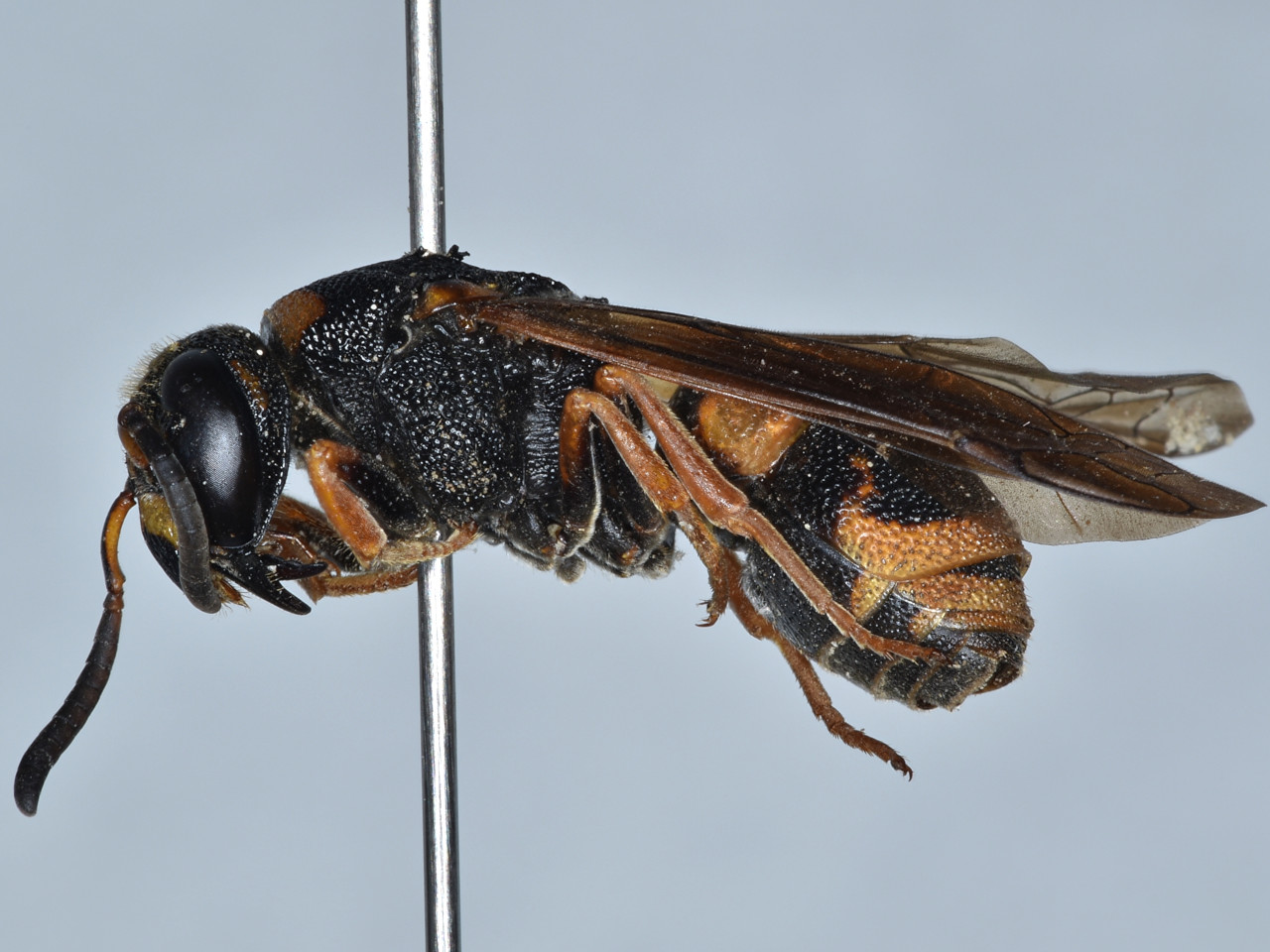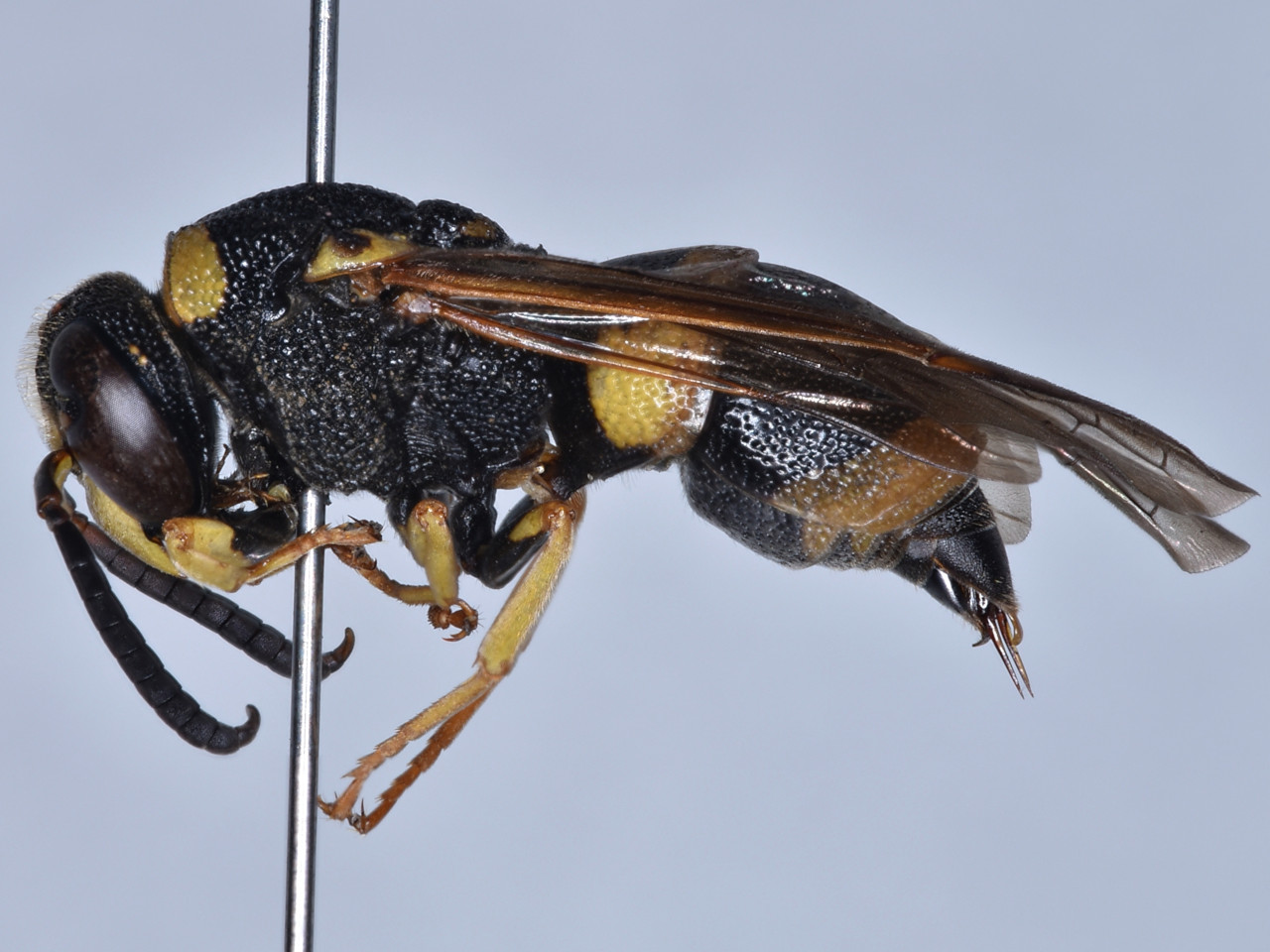 Body color black, with yellow bands on the first to third gastral tergites. The yellow band on the first tergite is thick and U-shaped. This species nests in bamboo tubes by partitioning cells with mud. It hunts larvae of moths of Pyralidae, Tortricidae, Geometridae, etc. It is divided into two subspecies depending on the region.
