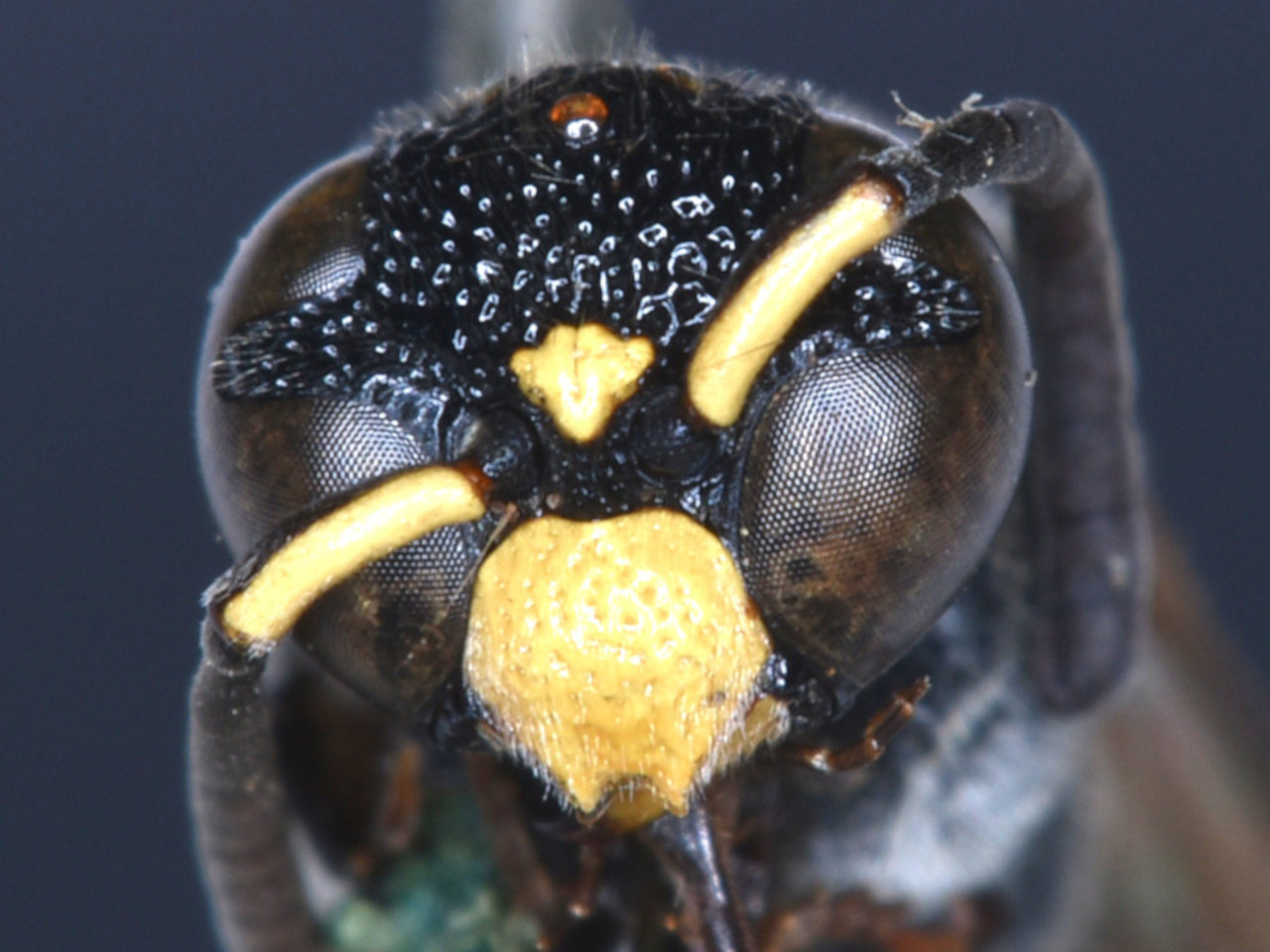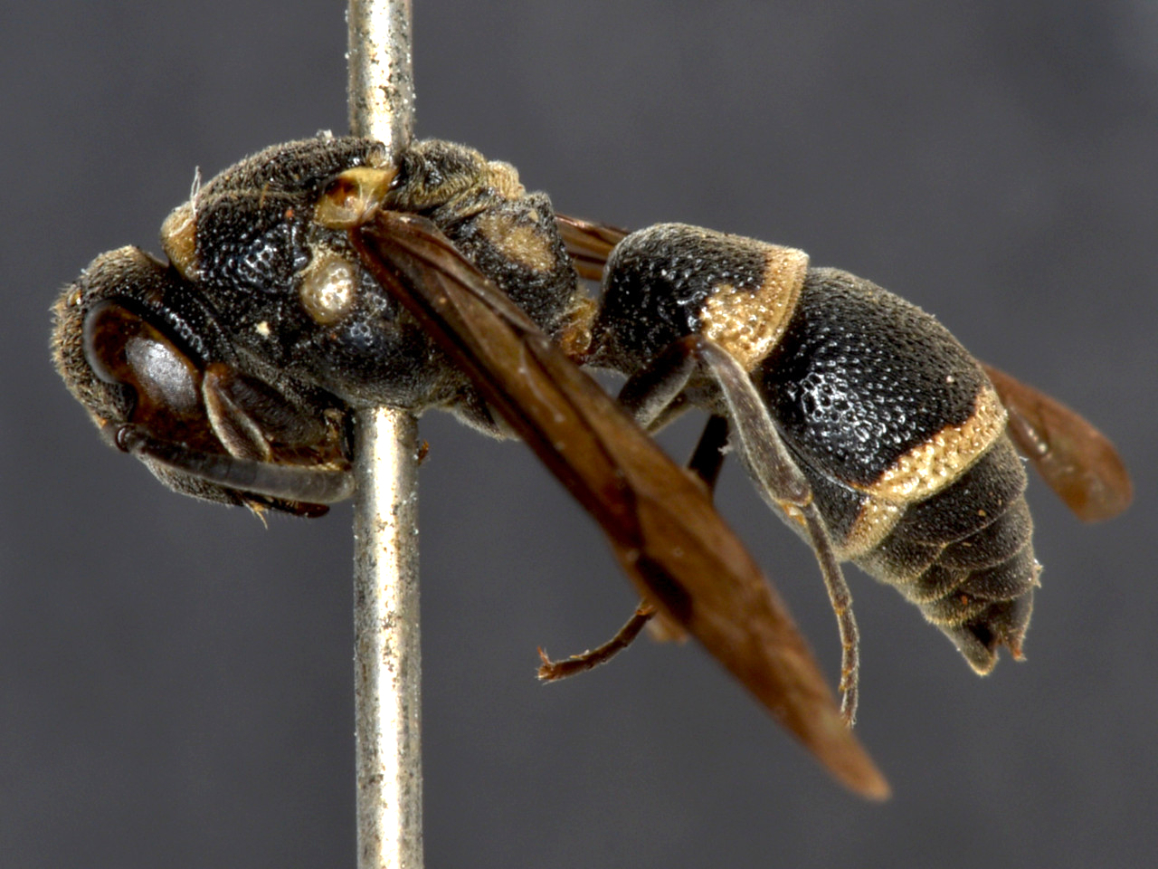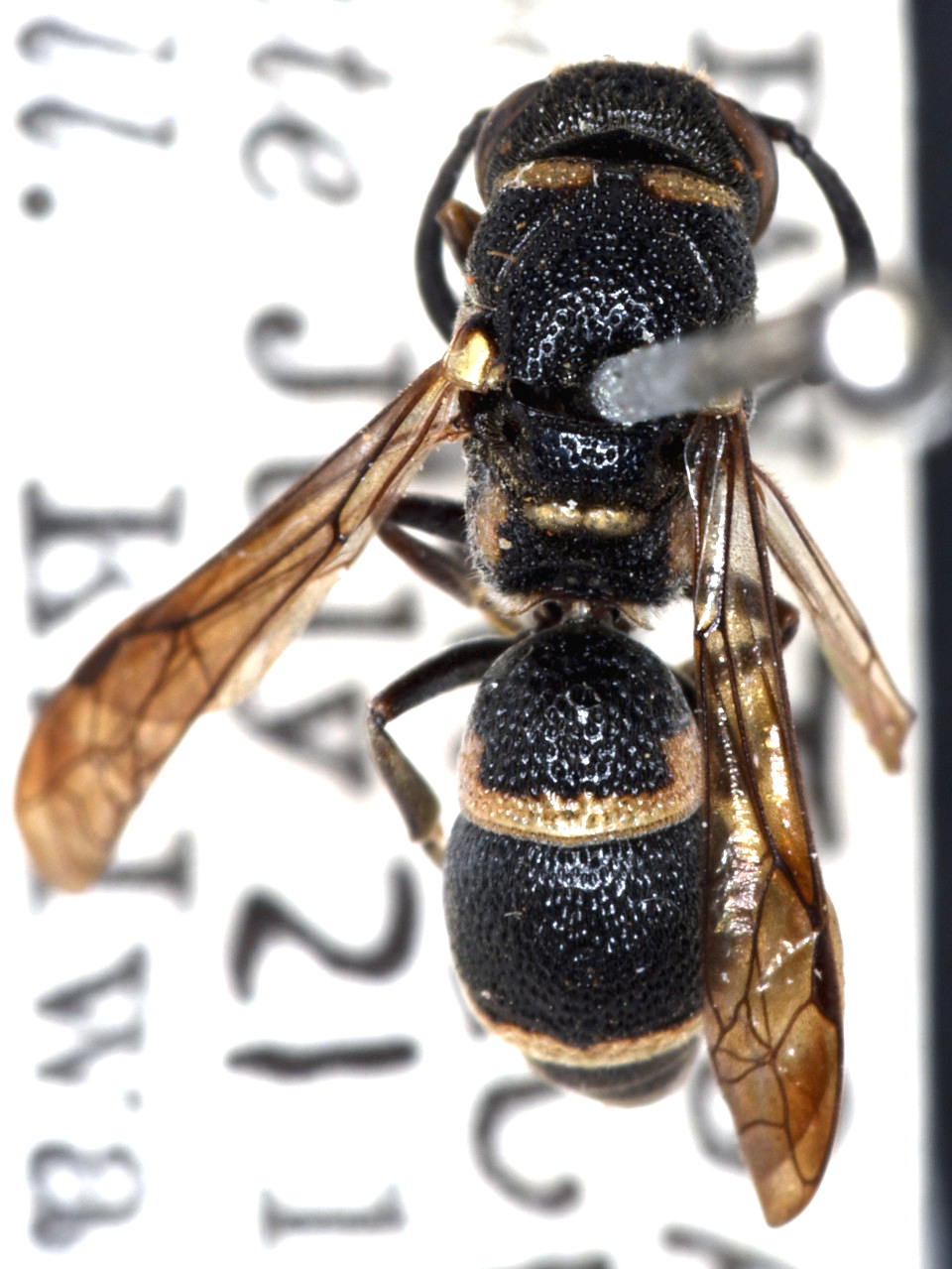 Stenodynerus frauenfeldi (de Saussure, 1867) Body black with a yellow band on the posterior margin of the first and second gastral tergites. Very similar to Stenodynerus chinensis, though distinguishable by a yellow spot on the tegulae. It hunts moth larvae of Tortricidae, etc.