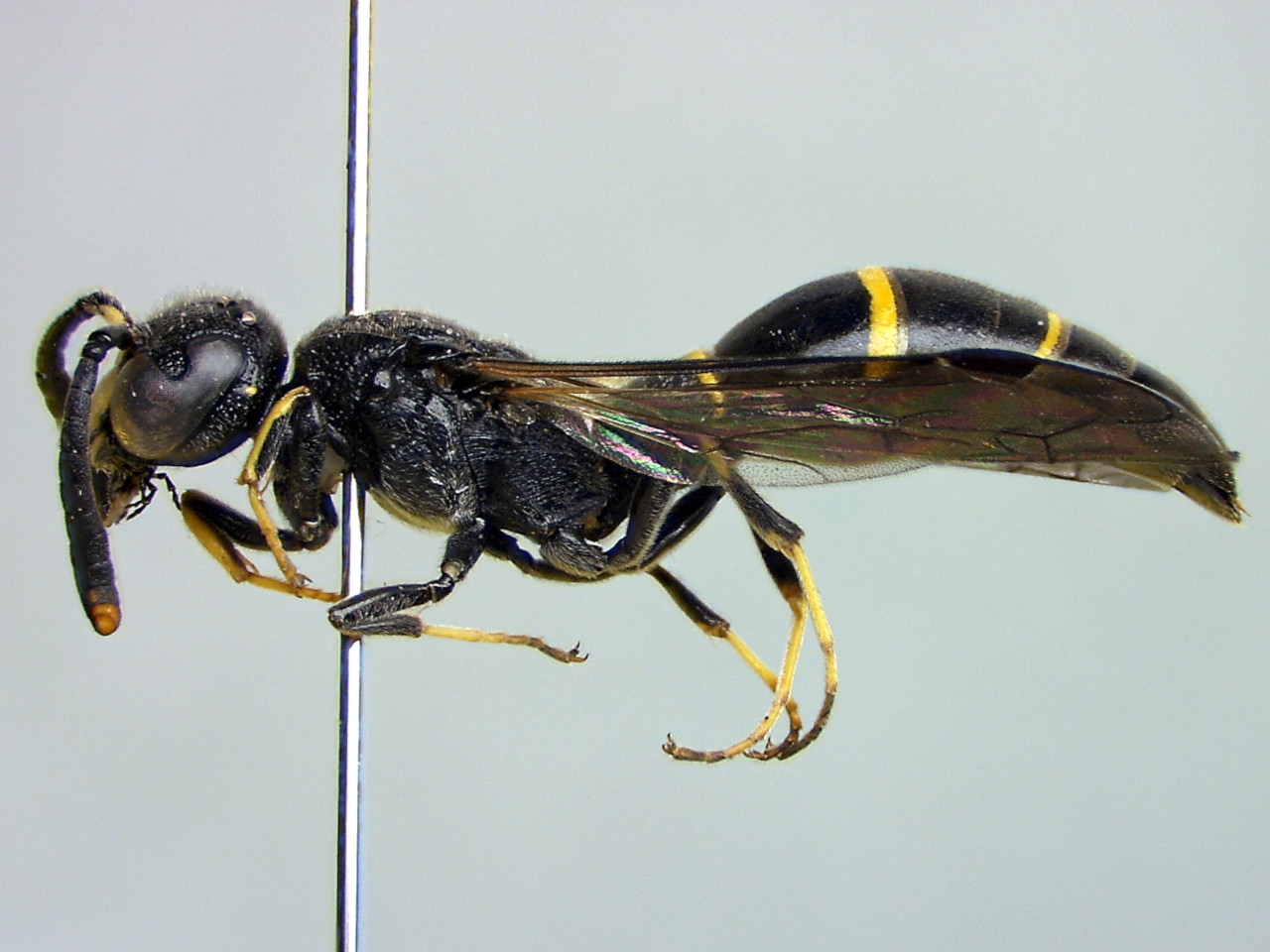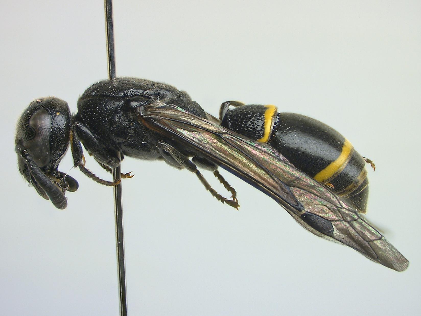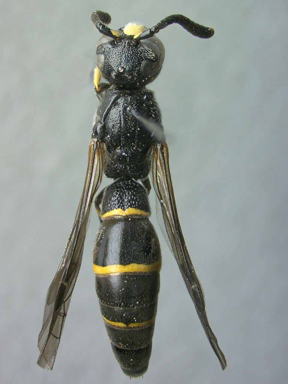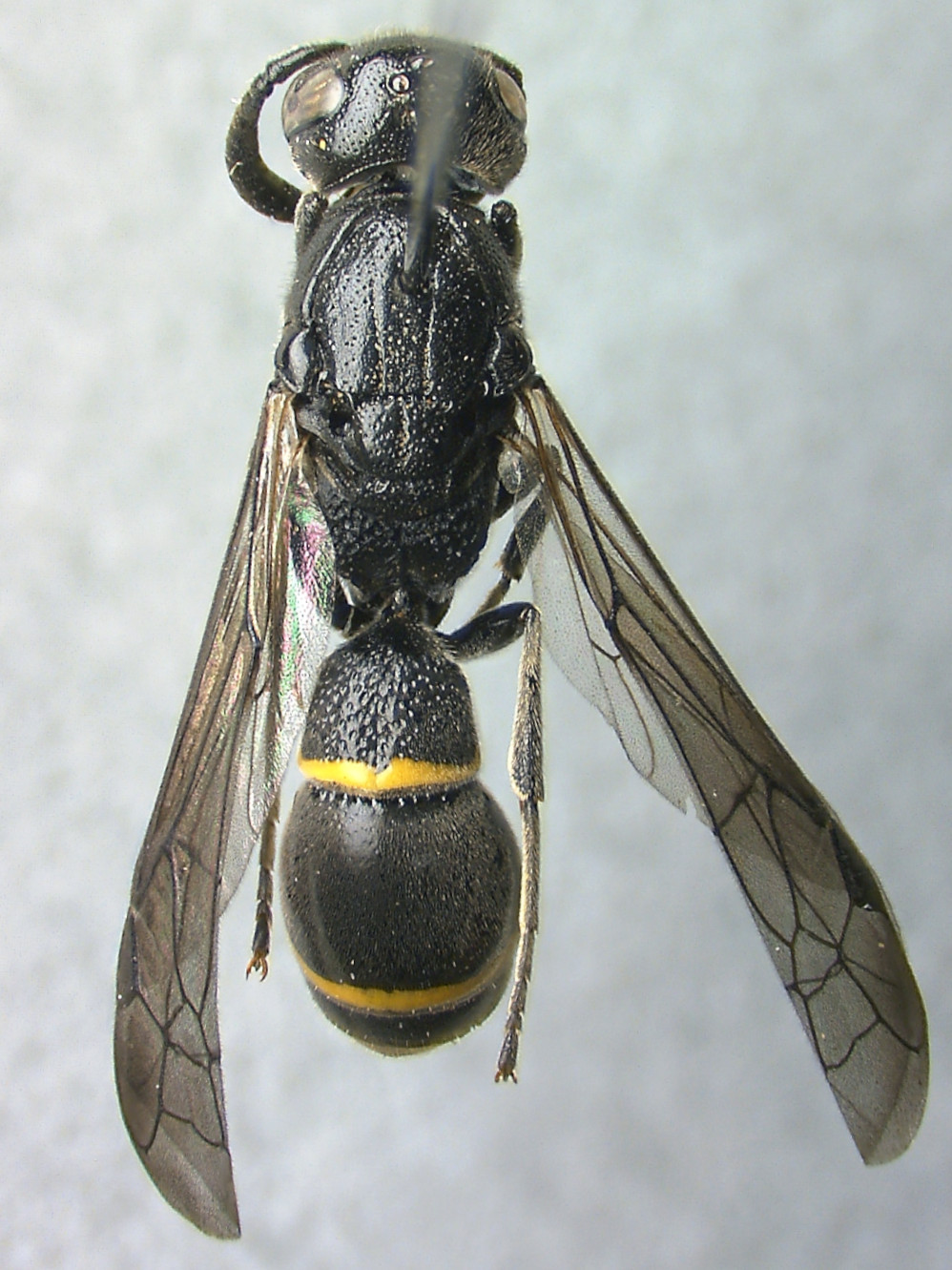 Symmorphus apiciornatus (Cameron, 1911) Body black, with yellow bands on posterior margin of first, second and fourth gastral tergites. Much smaller than Symmorphus foveolatus, with the first gastral segment wider than long which has a deep furrow in the middle. This species hunts larvae of flea weevils (Curculionidae), and frequently nests in thin reed tubes of thatched roofs.