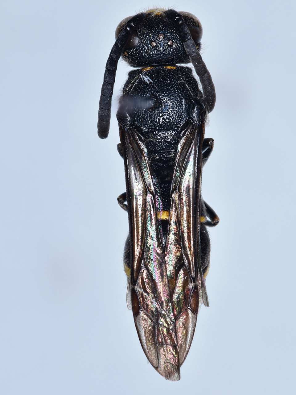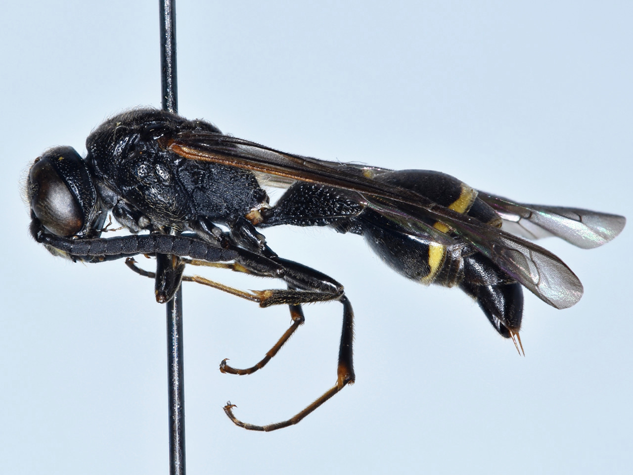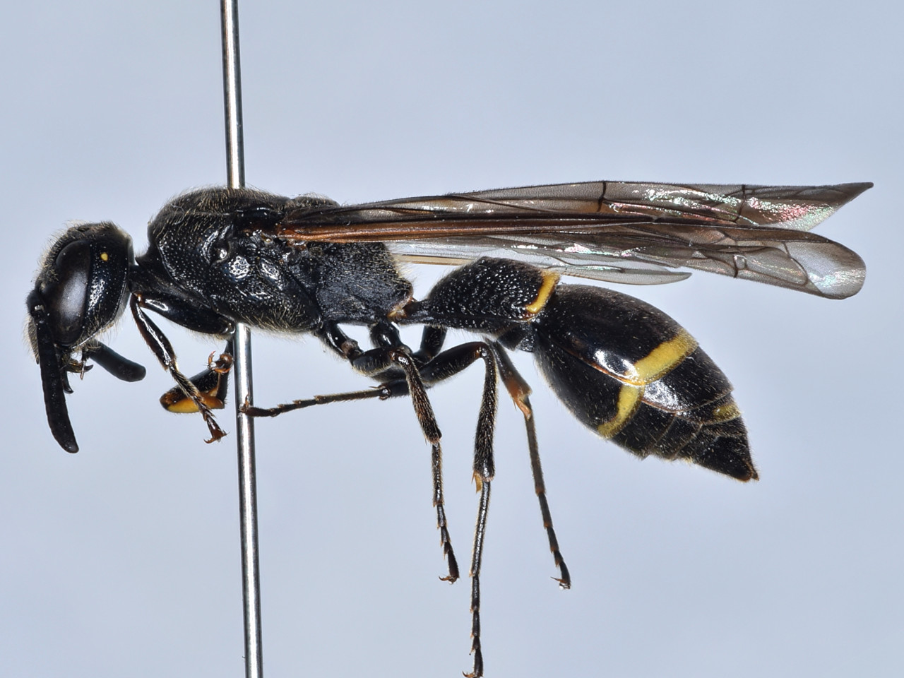 Body black with a yellow band on posterior margins of the first, second and fourth gastral tergites. This species differs from the other species of the genus in that the first gastral tergite is distinctly longer than wide when viewed from above. Abdomen shining. Paired pits present behind the ocellar area. Mesonotal dorsum with two longitudinal grooves, and one longitudinal groove in the middle of the first gastral tergite. This species nests in straw or reed tubes with mud partitions, and hunts larvae of leaf beetles (Chrysomelidae).