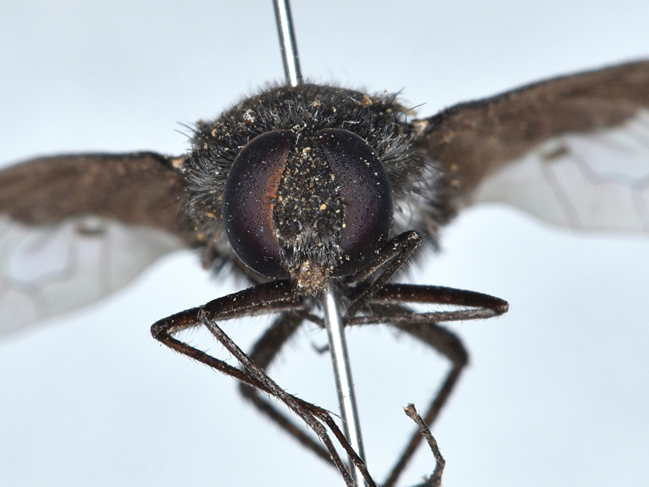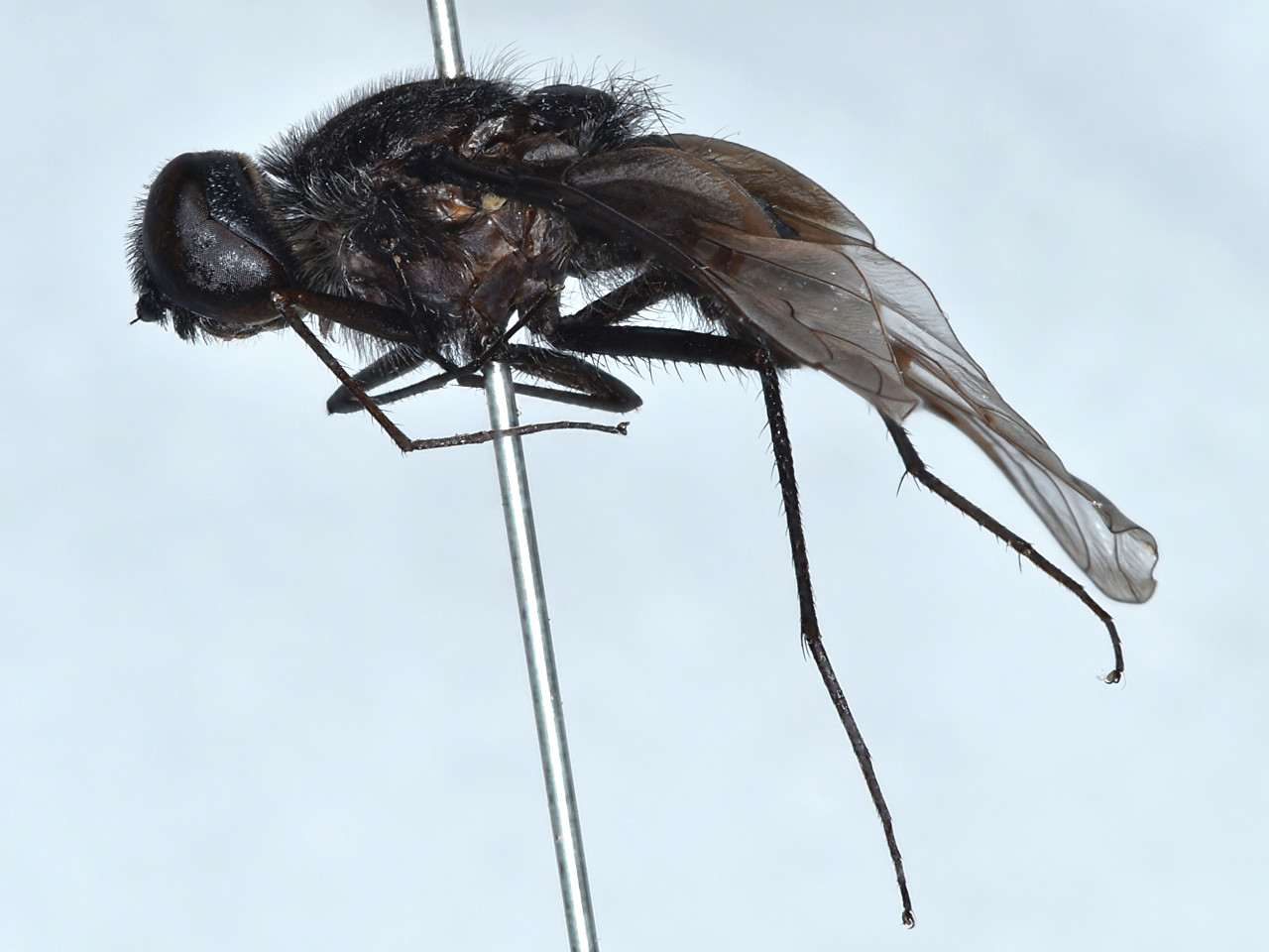 Body black. Lateral surfaces of first abdominal segment densely covered with long white hairs. The basal half of the wing is obliquely black, and the transparent apical half has two black spots. This fly is a parasitoid of many wasp and bee species.