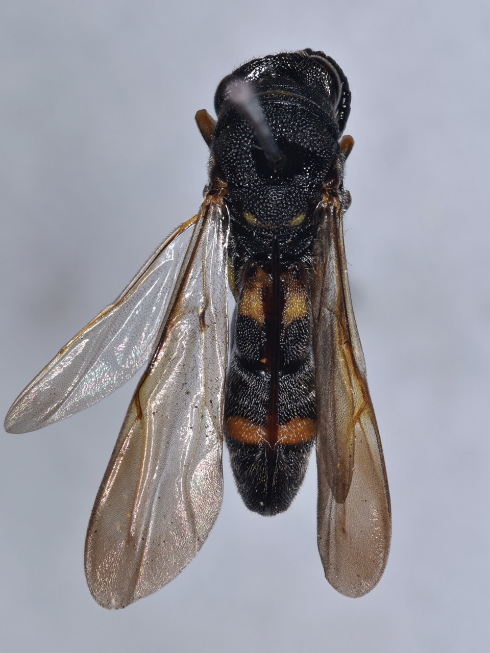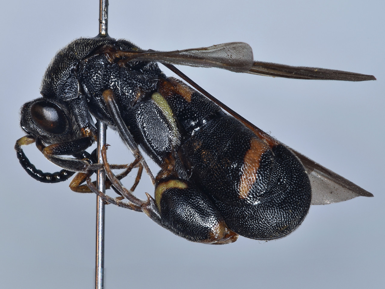 Body black, with yellow spots on gastral and other parts. Wings light brown. Females have a peculiar morphology in which the ovipositor is on the dorsal side of gaster.