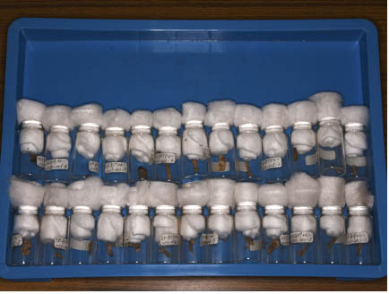 Place the cocoons or pupae each in a small glass vial, plug the vial with a cotton ball, and keep them under outdoor conditions, but away from the wind and rain. Do not place them in a warm room where temperatures and humidities are quite different from the natural habitats.