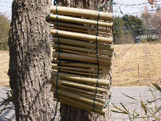 The trap-nest that we use is made of bamboo or reed tubes with an inner diameter of about 5–20 mm, cut into 20 cm pieces. Different species of bees and wasps prefer different diameters, so it is recommended to mix tubes of various diameters so that more species can nest. We can make a trap by arranging the tubes like a bamboo screen, or simply by bundling them with strings. Nesting frequencies and species compositions of bees and wasps have been shown to be alike between the two types of trap.