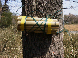 竹筒ハチ類を調べる方法が、「竹筒トラップ」とか「営巣トラップ」と呼ばれるものです。花粉媒介するハナバチを利用する目的でも使われてきました。
